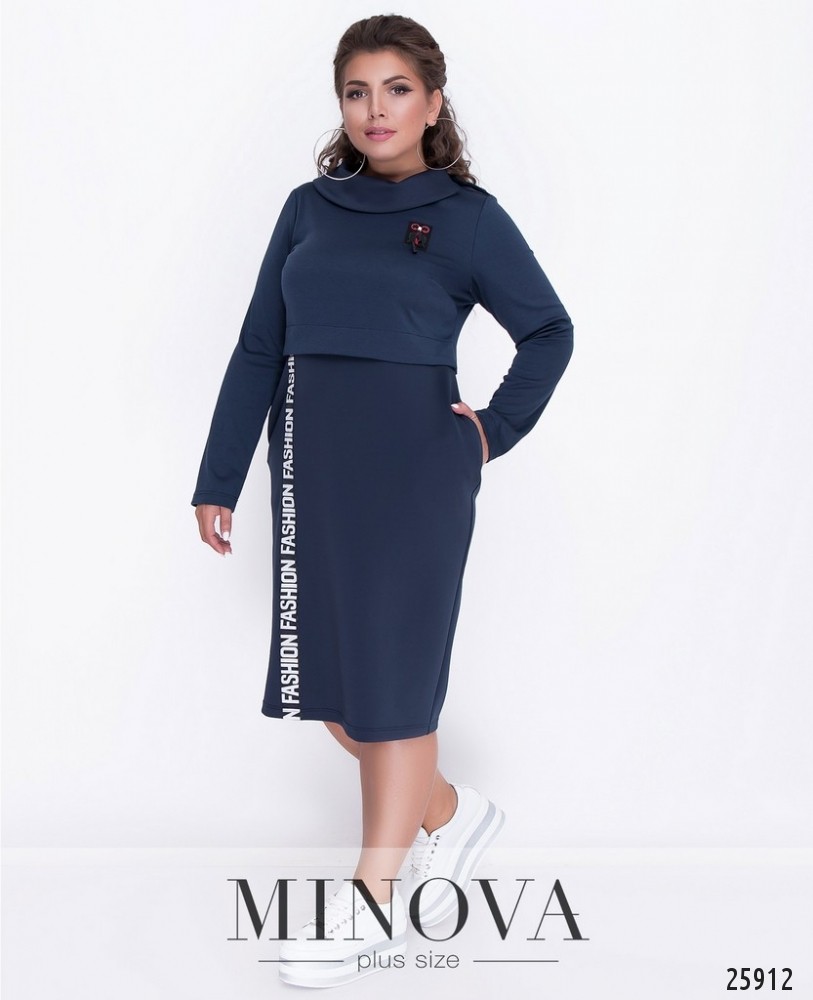 Платье в спортивном стиле из плотного трикотажа с воротником-хомутом и отрезной завышенной талией. Лиф платья скроен с помощью выточек на груди. Горловина застегивается на две пуговицы сбоку. Отрезной подол с карманами изготовлен из другого материала и оформлен декоративной лентой с надписью. На спинке подол с вырезом по линии шага.