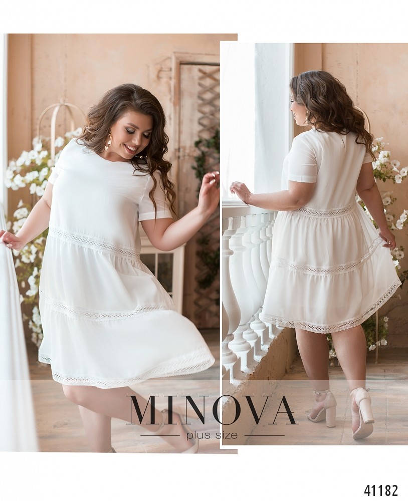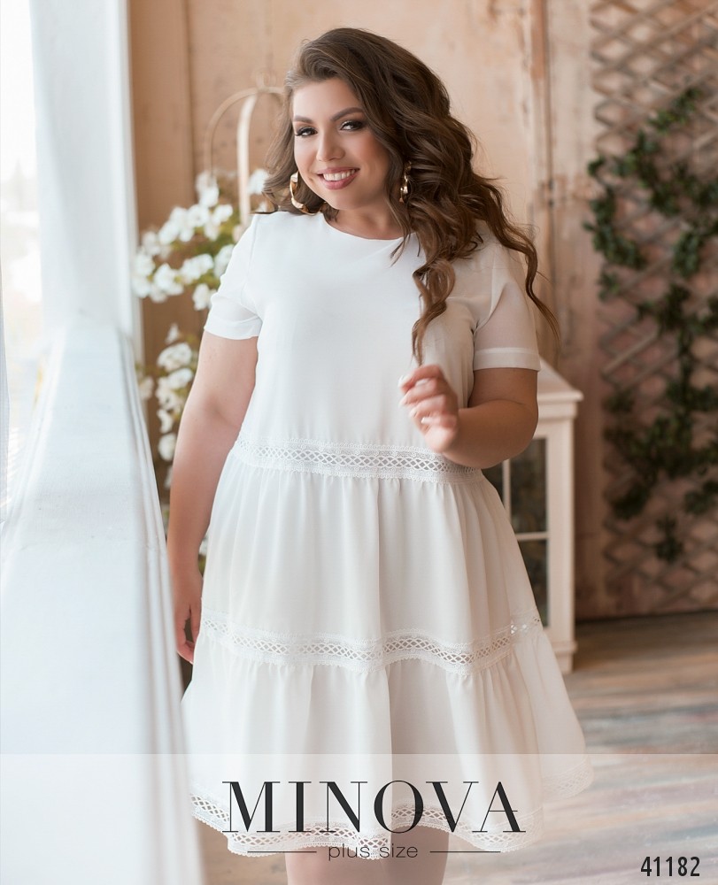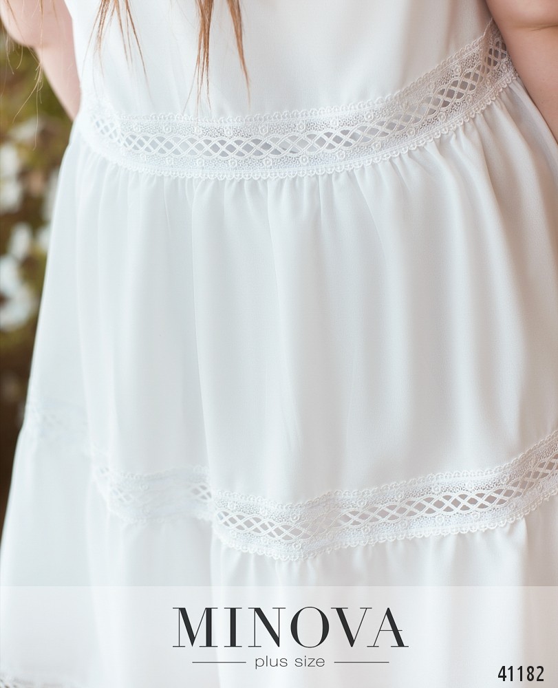 Женственное минималистичное платье большого размера с оборками на подоле и вставками ажурного кружева. Карманов нет, рукава без манжет, вырез горловины полукруглый. Застёжка - пуговка сзади под шеей.