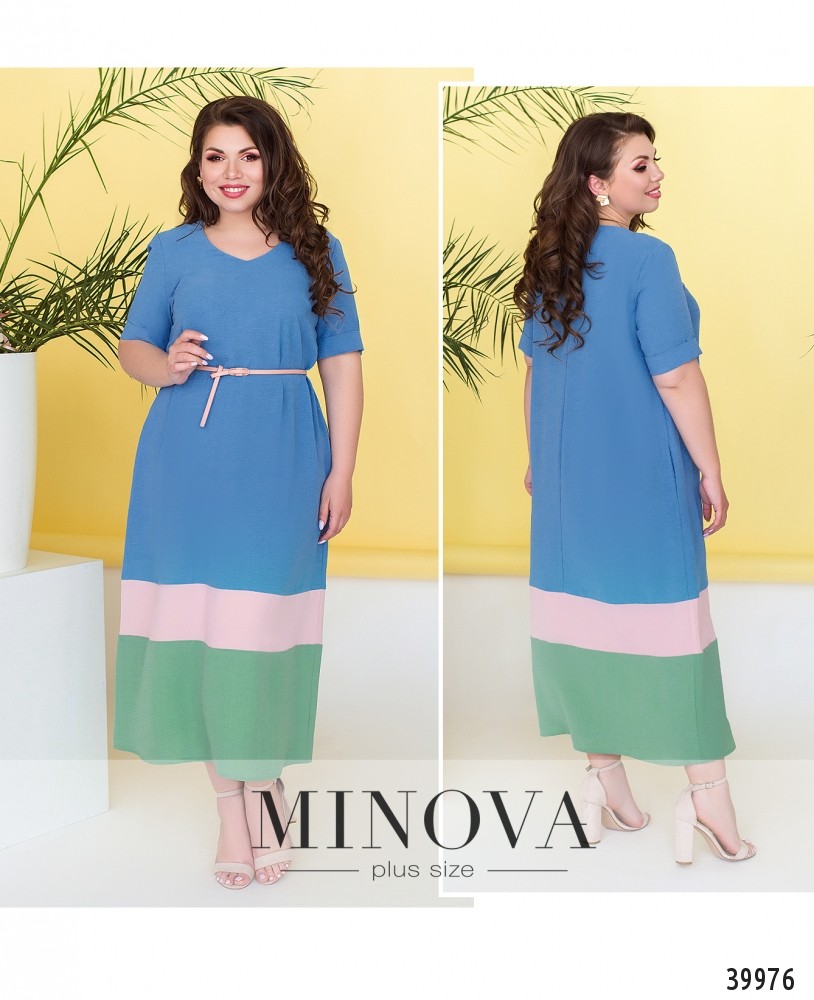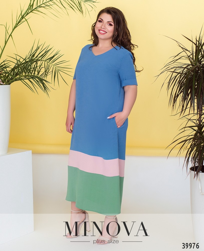 Лёгкое и стильное платье батал с врезными карманами по бокам, рукава короткие, с подворотами, вырез горловины неглубокий, на груди вытачки, застёжек нет.
