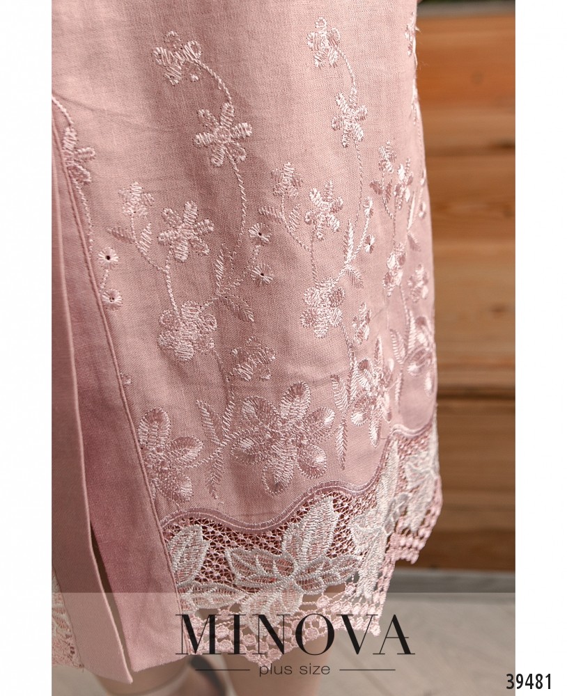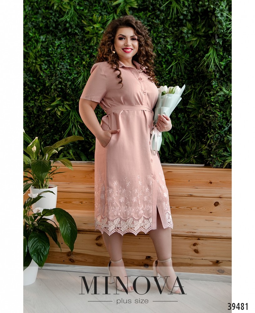 Минималистичное и элегантное платье-рубашка с поясом, застёгивается на ряд пуговиц спереди на планке. Воротничок отложной, рукава короткие, без манжет. Силуэт приталенный. По бокам - врезные карманы. Подол украшен очаровательной вышивкой и нежным кружевом.