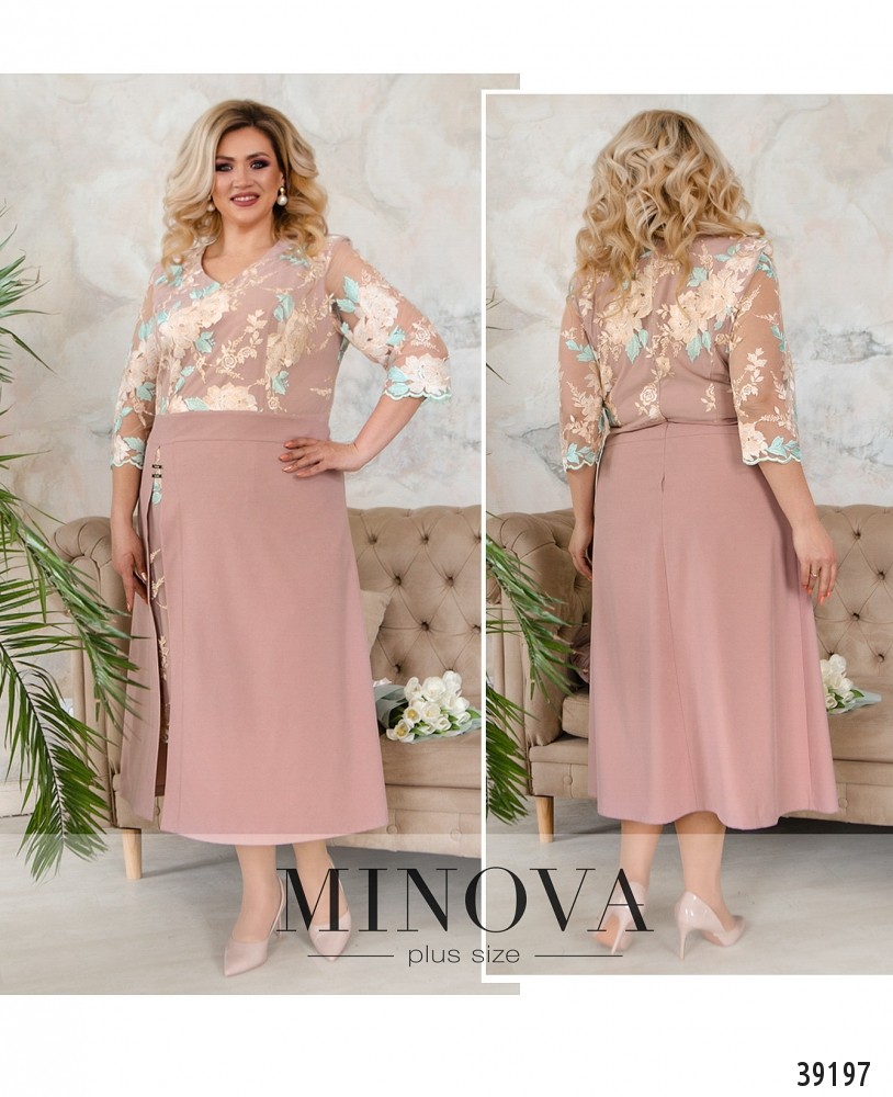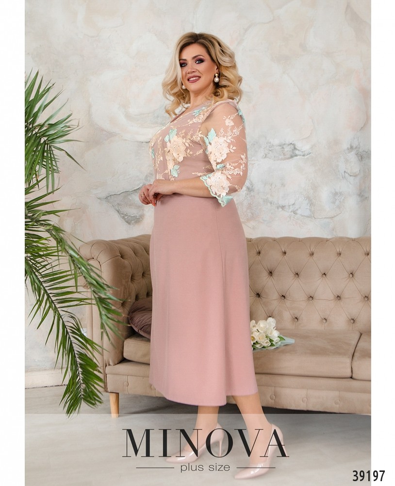 Нарядное вечернее платье батал с ажурной сеточкой на лифе, украшенной вышивкой - спереди и по спинке. Лиф с подкладкой, рукава - из прозрачной сеточки, без манжет. Подол подшит к верху, с разрезом, прихваченным двумя декоративными металлическими нашивками, под ним - вставка сеточки с вышивкой. Сзади на подоле шлица, застёжка - вшитая по спинке молния. Карманов нет. Вырез горловины неглубокий.