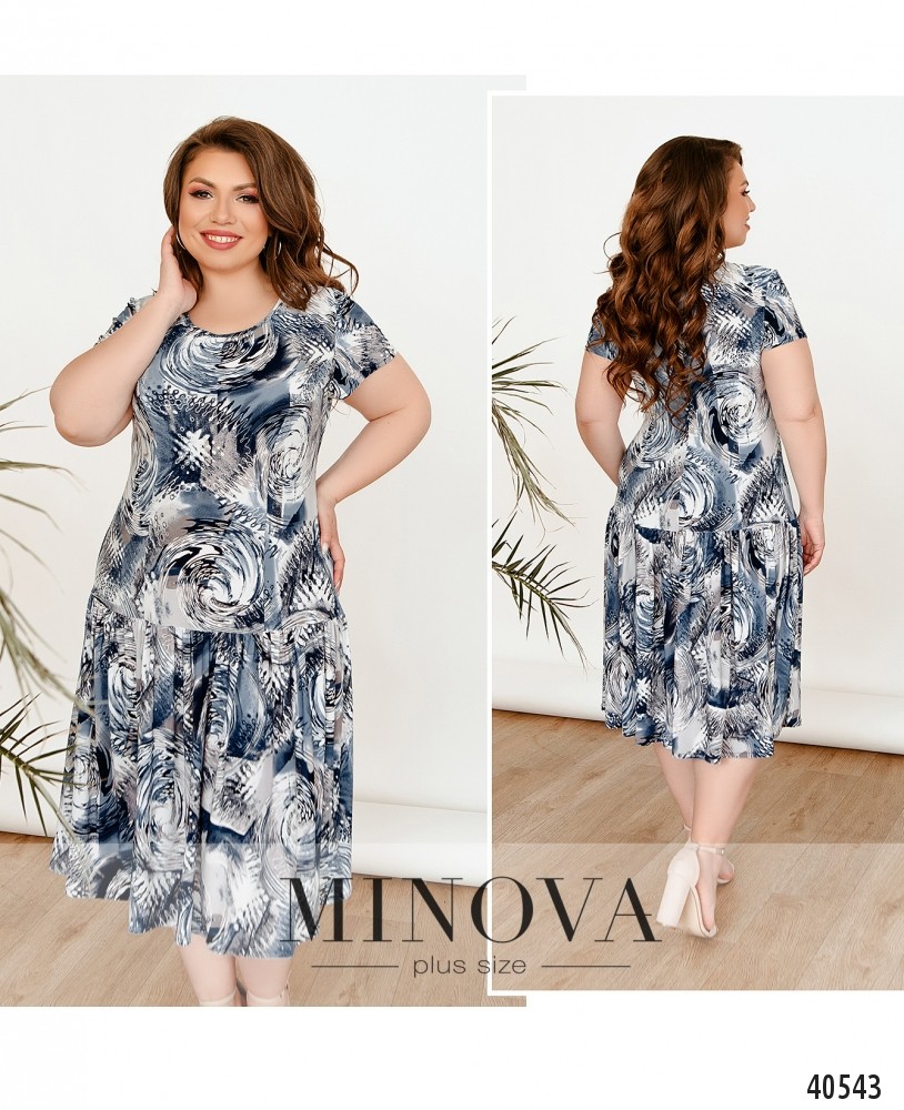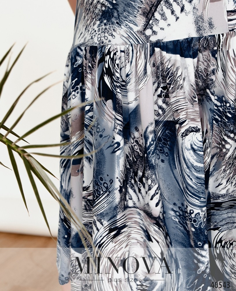 Оригинальное платье батал с ярким принтом, без застёжек и карманов, подол с подшитыми длинными оборками, рукава короткие, без манжет. Вырез горловины полукруглый.