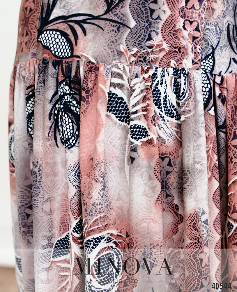 Оригинальное платье батал с ярким принтом, без застёжек и карманов, подол с подшитыми длинными оборками, рукава короткие, без манжет. Вырез горловины полукруглый.