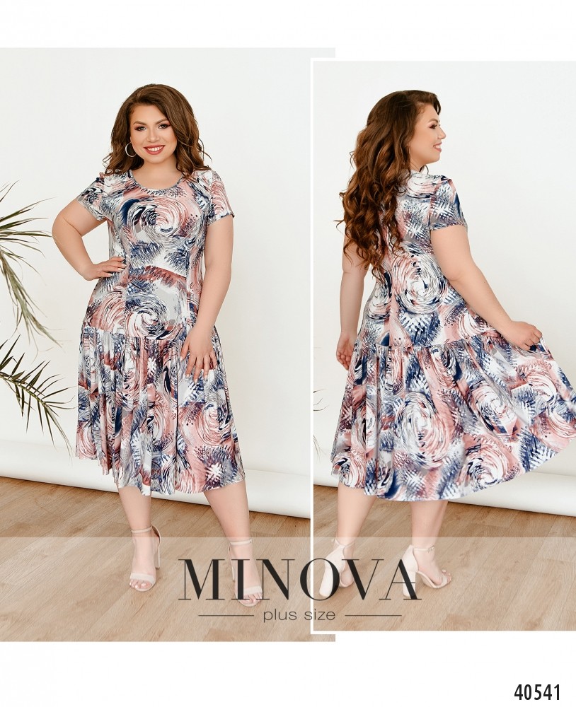 Оригинальное платье батал с ярким принтом, без застёжек и карманов, подол с подшитыми длинными оборками, рукава короткие, без манжет. Вырез горловины полукруглый.