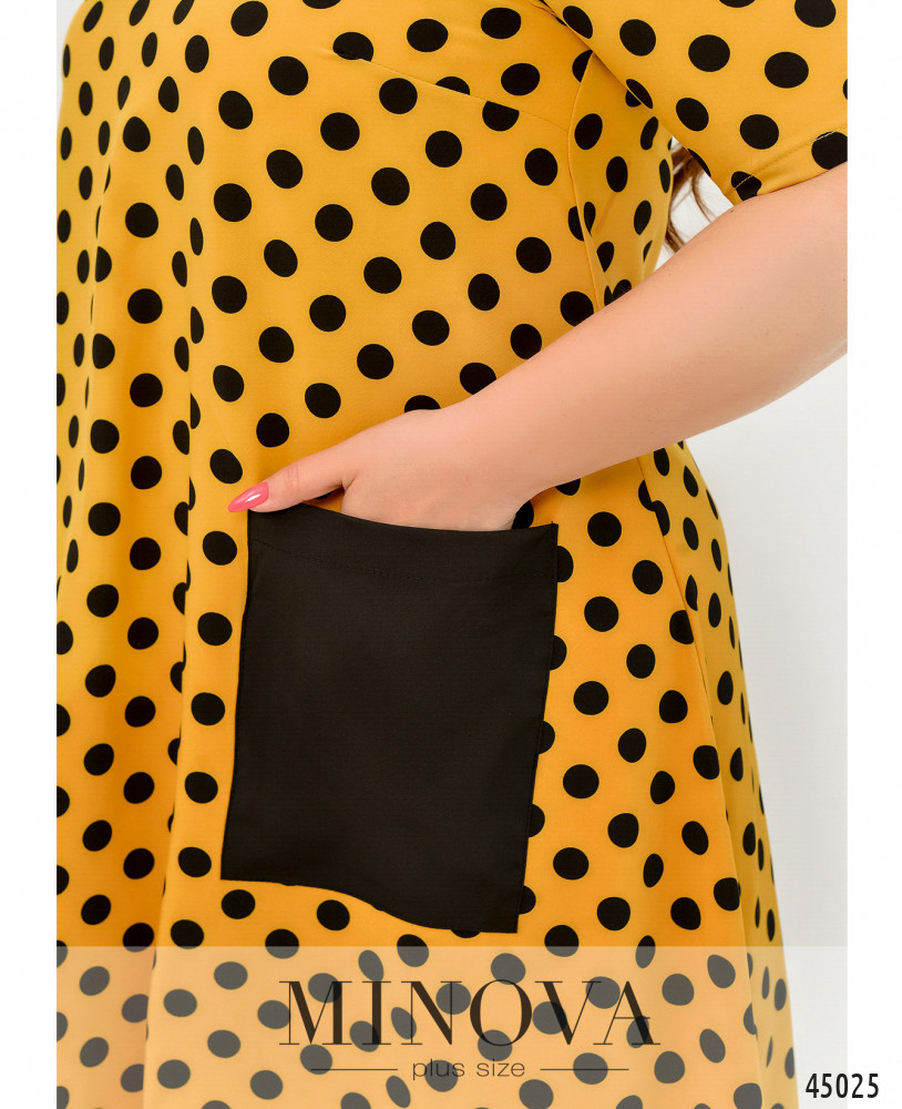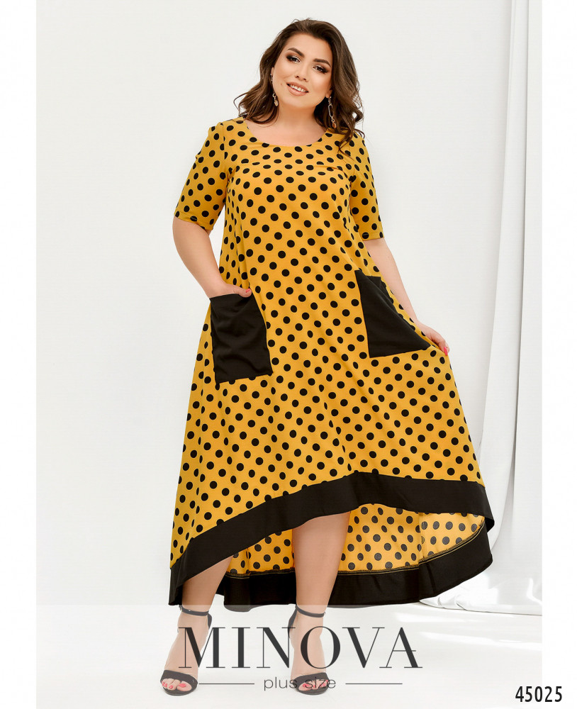 Оригинальное платье батал без застёжек, с яркими контрастными накладными карманами на бёдрах и окантовкой асимметричного подола - по спинке длиннее. Вырез горловины полукруглый, рукава без манжет, на груди вытачки.