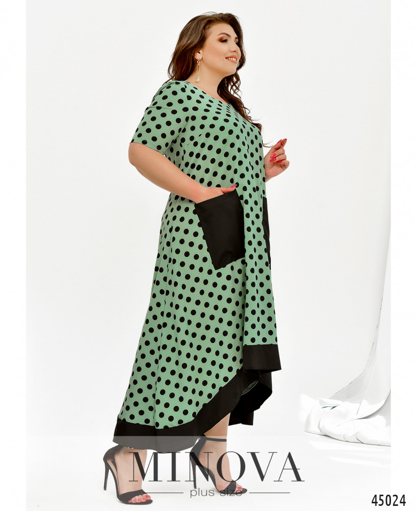 Оригинальное платье батал без застёжек, с яркими контрастными накладными карманами на бёдрах и окантовкой асимметричного подола - по спинке длиннее. Вырез горловины полукруглый, рукава без манжет, на груди вытачки.