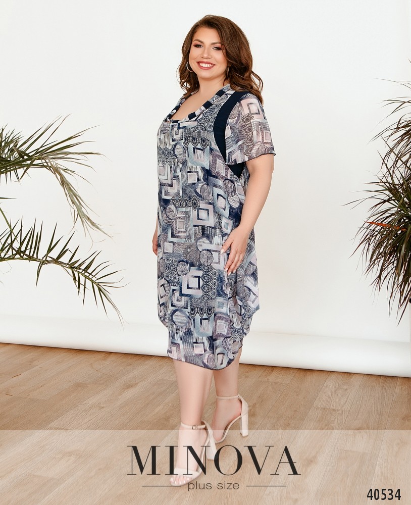 Привлекательное платье батал фасона "баллон", А-силуэта. Платье состоит из двух подшитых друг к другу частей, верхняя - полупрозрачная, нижняя - мягкая. Рукава-крылышки, лёгкие, свободные. Застёжек и карманов нет. Вырез горловины полукруглый.
