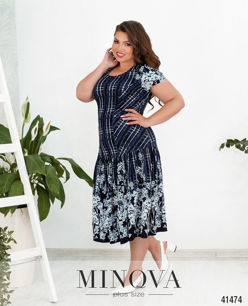 Очаровательное платье большого размера с цветочным принтом. Застёжек и карманов нет, вырез горловины полукруглый, подол с подшитыми мягкими оборками. Рукава без манжет.