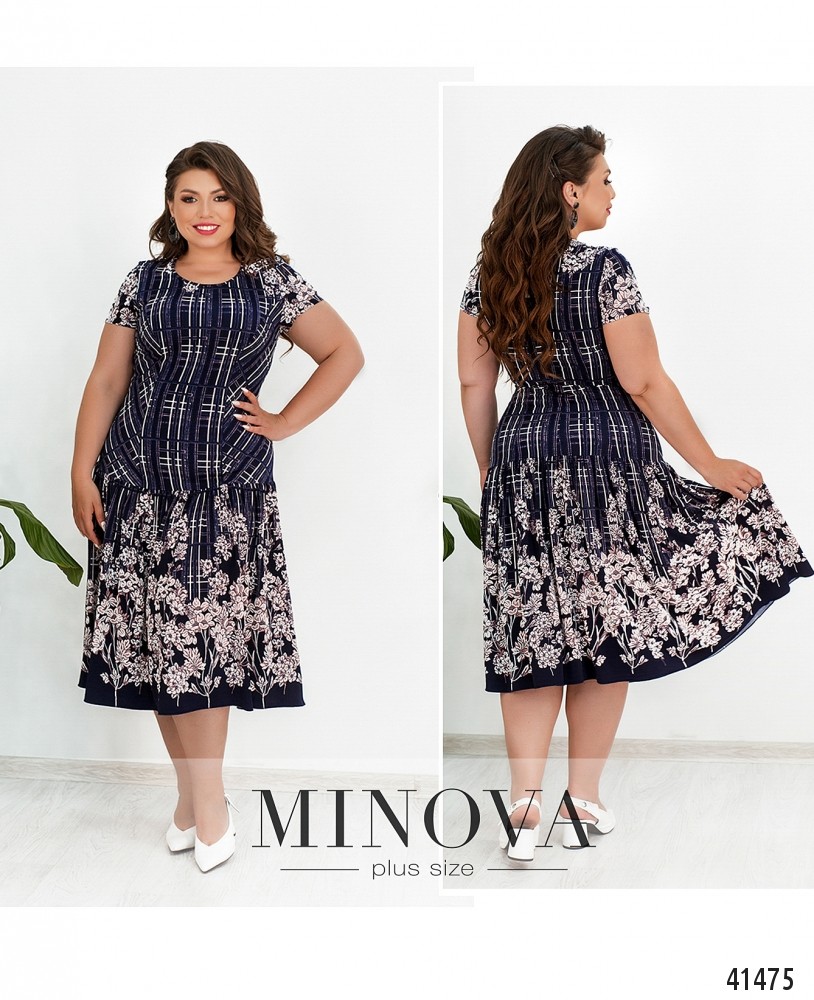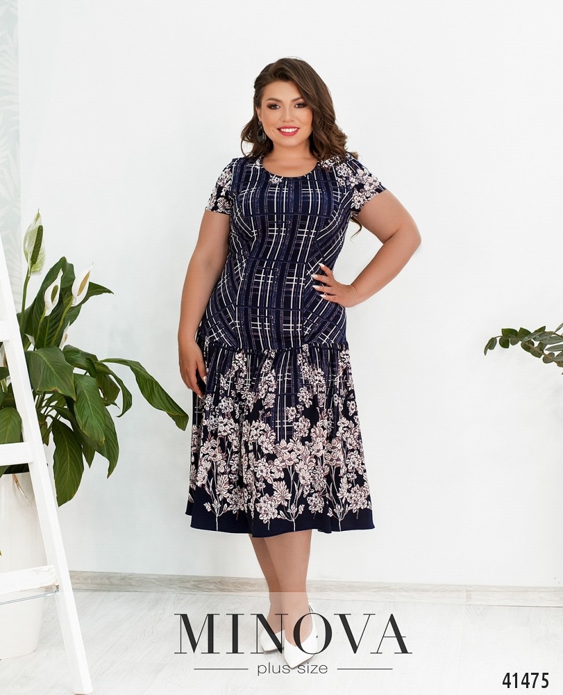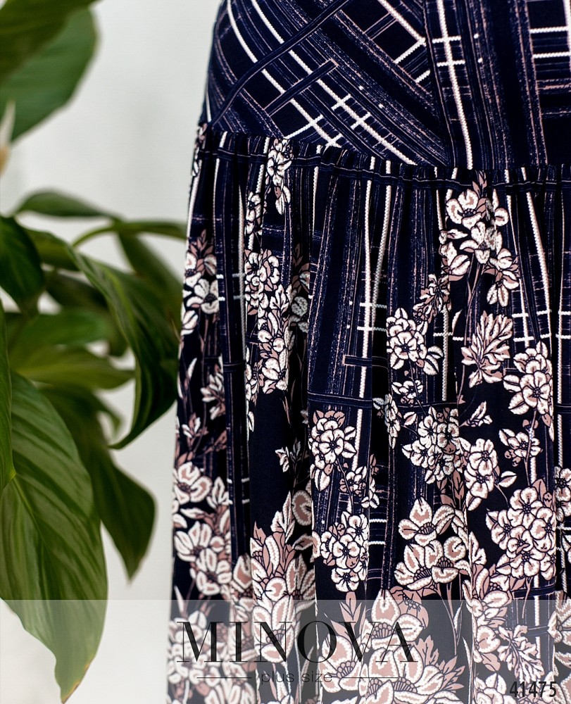 Очаровательное платье большого размера с цветочным принтом. Застёжек и карманов нет, вырез горловины полукруглый, подол с подшитыми мягкими оборками. Рукава без манжет.