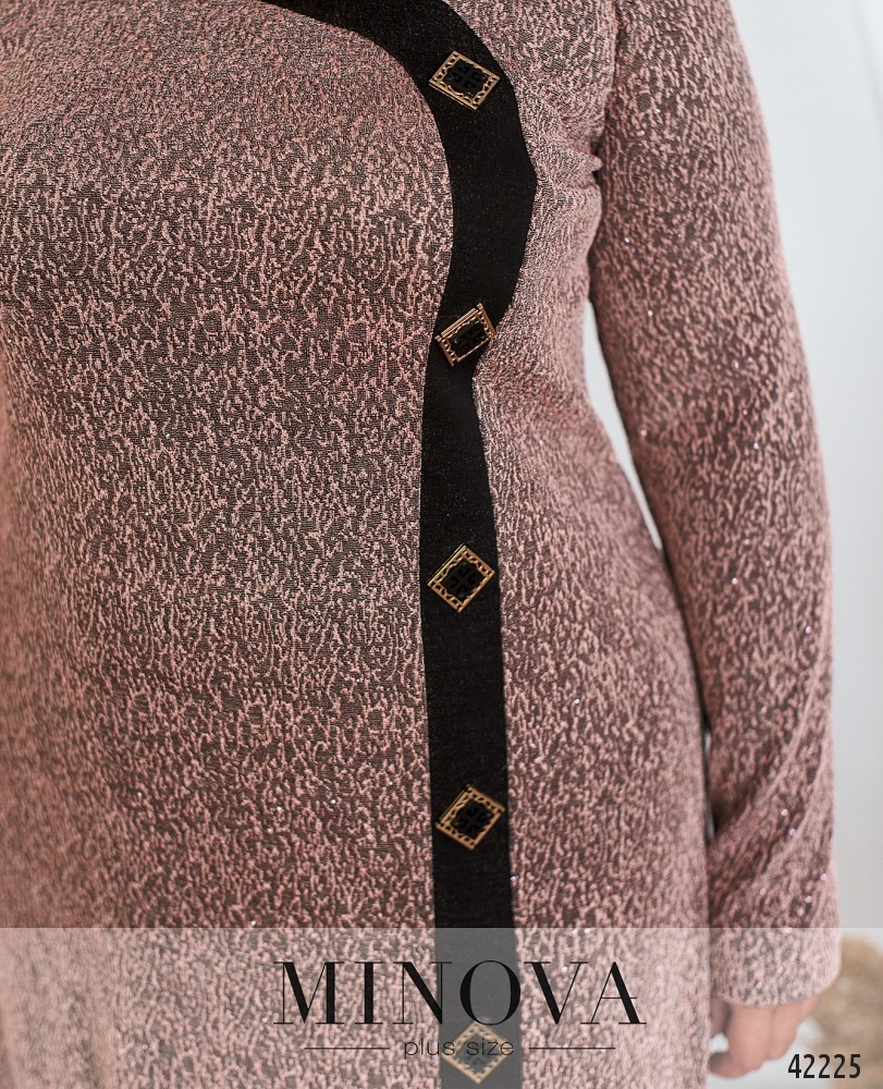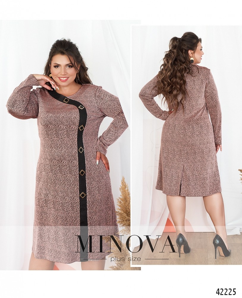 Нарядное платье батал без застёжек и карманов, с полукруглым вырезом горловины. Спереди на планке нашиты элегантные ромбовидные пуговицы. На груди - вытачки, рукава без манжет. Ткань декорирована люрексом, снизу гладкая.