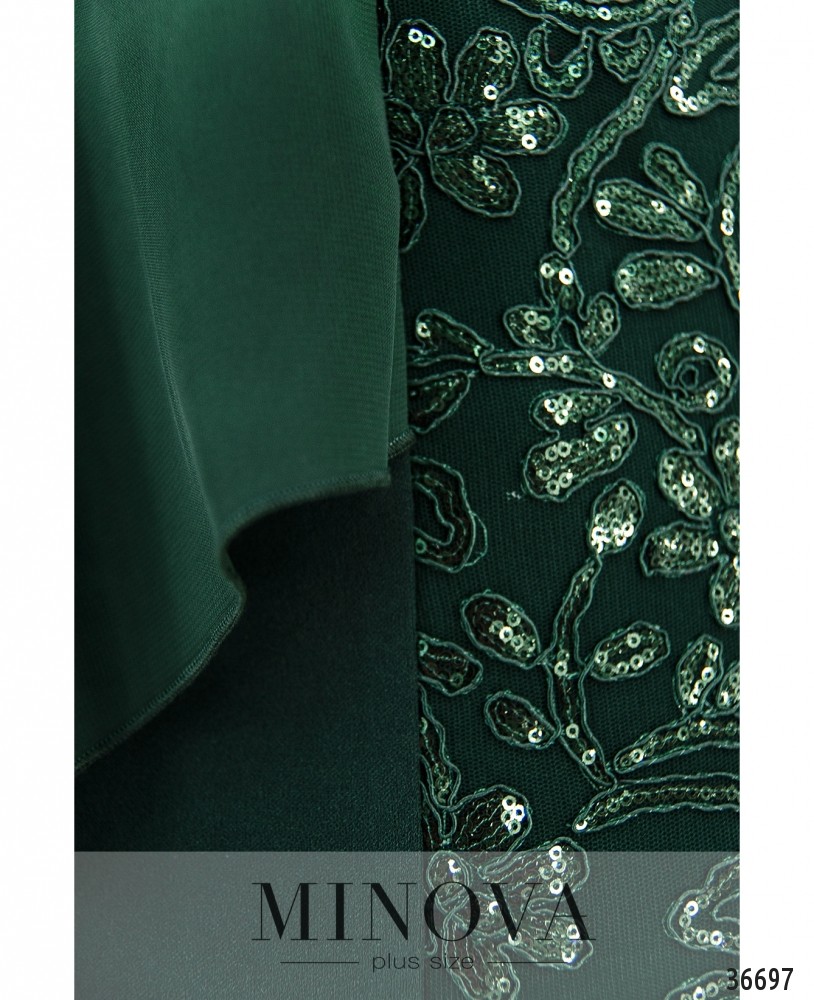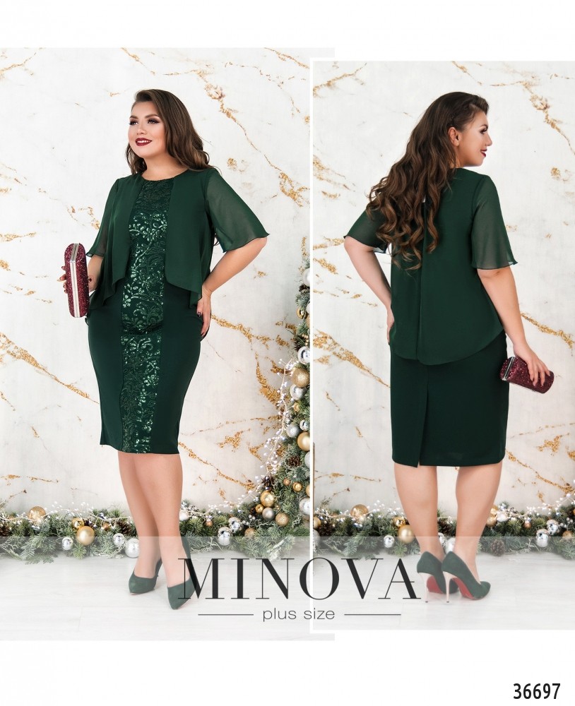 Нужно выглядеть нарядно и в то же время сдержанно? Minova предлагает отличный вариант платья батал. Платье прямого кроя, но эта особенность сглаживается подшитой сверху накидкой, ниспадающей мягкими асимметричными складками. Ткань мягкая, приятная к телу. Спереди по центру – широкая полоса с вышивкой и пайетками, от полукруглого выреза горловины до подола. Карманы и застёжки отсутствуют. Накидка из полупрозрачной ткани, сзади полностью закрывает спинку до бедра. Рукава до локтя, без подкладки и манжет, полупрозрачные, свободные. Платье длины миди, будет хорошо смотреться на любой фигуре с обувью на танкетке или каблуке.
