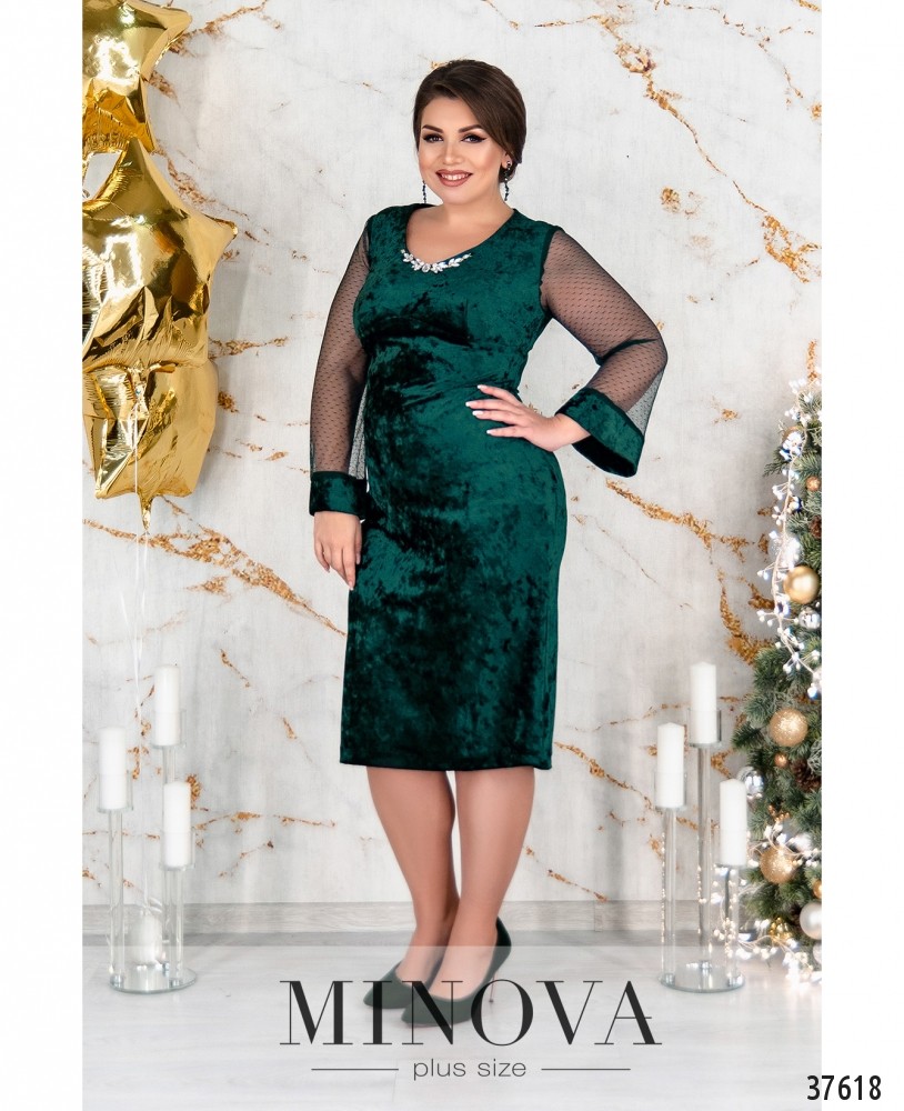 Элегантное вечернее платье плюс сайз с высокой талией, без карманов и застёжек, вырез горловины V-образный, украшен стразами. На рукавах из полупрозрачной сеточки - плотные манжеты.