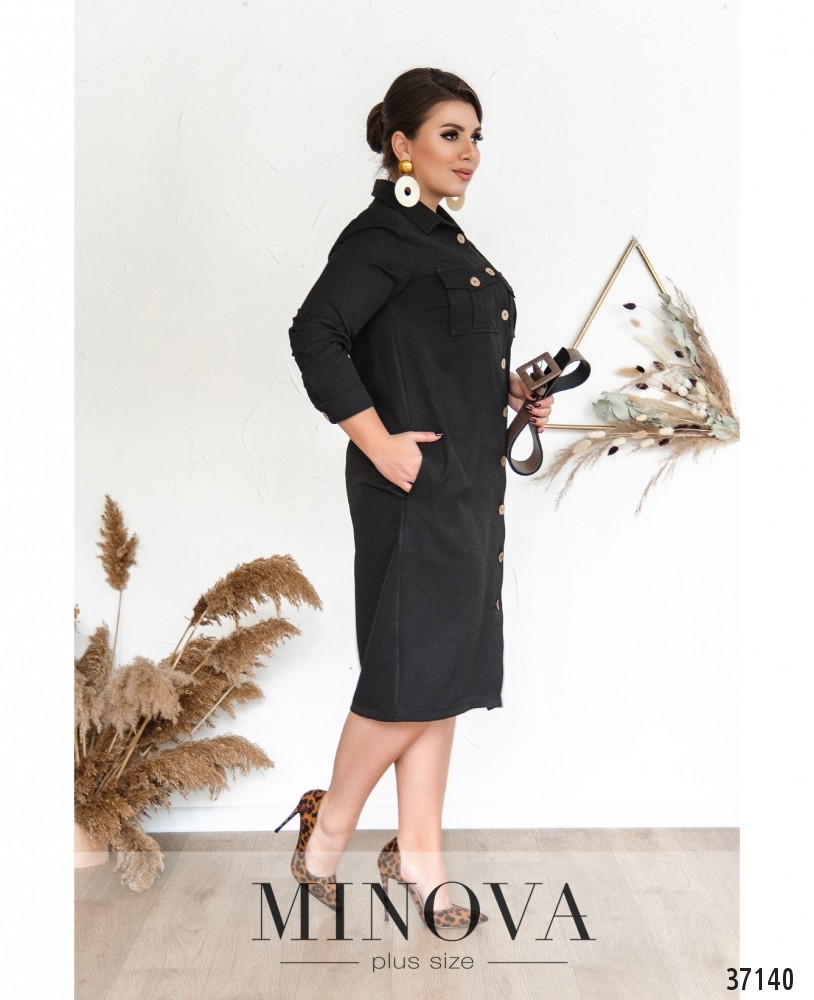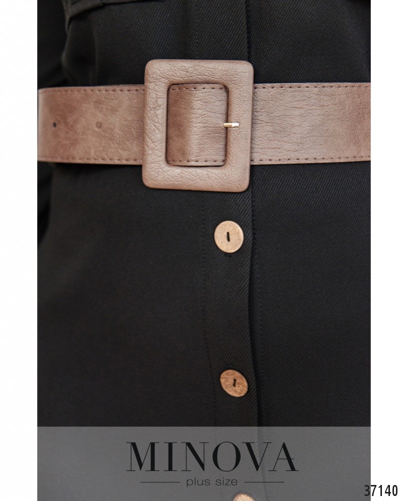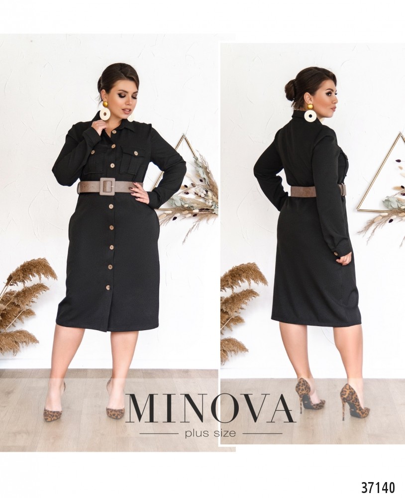 Осенне-зимний гардероб стоит дополнить строгой, но оригинальной моделью платья батал. Minova предлагает отлично подходящую модель: платье в стиле рубашки, приталенное, из мягкой ткани. Воротник отложной, застёжка – ряд пуговиц от воротника до подола. На груди два накладных функциональных кармана с листочками и пуговицами. Рукава полной длины, с небольшими манжетами, на манжетах по одной пуговице. По бокам – врезные карманы, на груди – диагональные вытачки на карманах. Особого изящества наряду добавляет плотный ремень с крупной пряжкой, который идёт в комплекте. Вы можете экспериментировать с обувью и украшениями. Пояс/аксессуар входит в комплект.