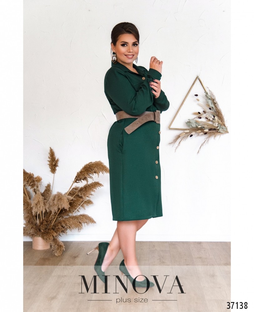 Осенне-зимний гардероб стоит дополнить строгой, но оригинальной моделью платья батал. Minova предлагает отлично подходящую модель: платье в стиле рубашки, приталенное, из мягкой ткани. Воротник отложной, застёжка – ряд пуговиц от воротника до подола. На груди два накладных функциональных кармана с листочками и пуговицами. Рукава полной длины, с небольшими манжетами, на манжетах по одной пуговице. По бокам – врезные карманы, на груди – диагональные вытачки на карманах. Особого изящества наряду добавляет плотный ремень с крупной пряжкой, который идёт в комплекте. Вы можете экспериментировать с обувью и украшениями. Пояс/аксессуар входит в комплект.