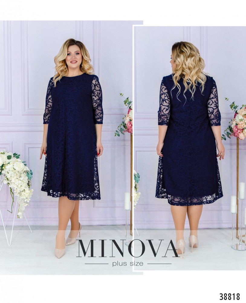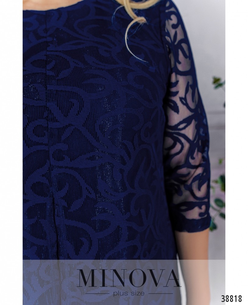 Элегантное платье батал А-силуэта, без застёжек и карманов, с мягкой подкладкой и ажурным гипюром сверху. Рукава из гипюра без подкладки, без манжет. Вырез горловины полукруглый, неглубокий.