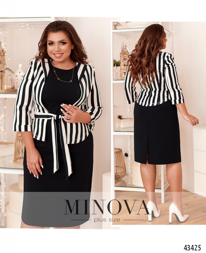 Нарядный костюм большого размера с жакетом и платьем. Платье без рукавов, без карманов и застёжек, вырез горловины полукруглый, сзади на подоле шлица. Жакет без подкладки, с подплечниками, без застёжек и карманов, завязывается на ленты спереди. Лацканы небольшие, рукава с мягкими манжетами без пуговиц.