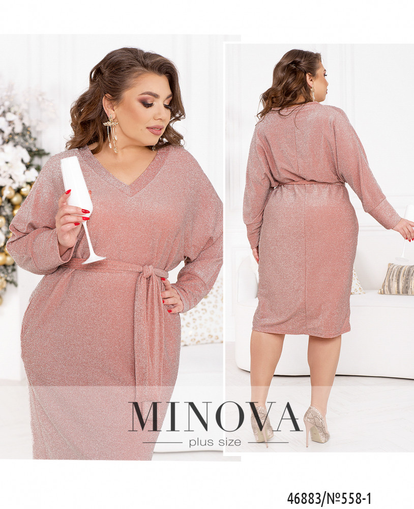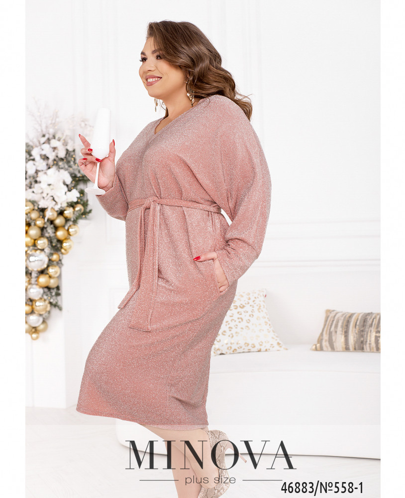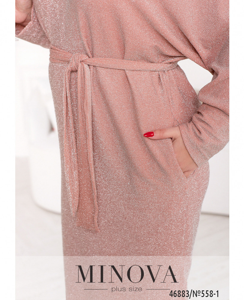 Монохромное мерцающее платье считается универсальным предметом, одежды, который можно надеть на любое праздничное мероприятие. Модель с V-образным вырезом дополнена рукавами "летучая мышь" с манжетами и карманами в боковых швах.