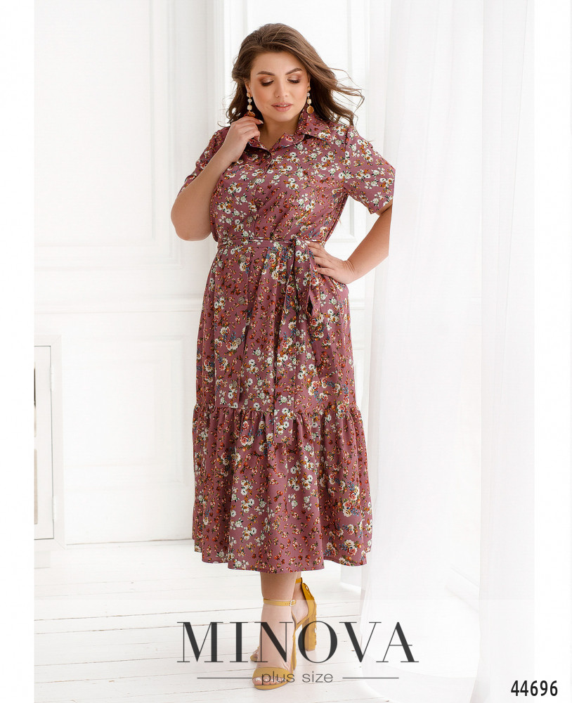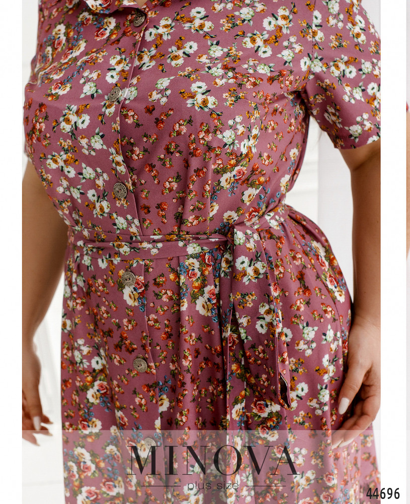 Яркое платье батал с нежным принтом, воротничок отложной, застёжка - ряд пуговиц спереди на планке, от воротничка до оборок, которые украшают подол. Рукава без манжет. Карманов нет.