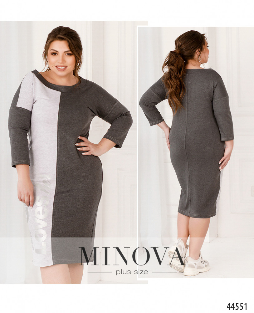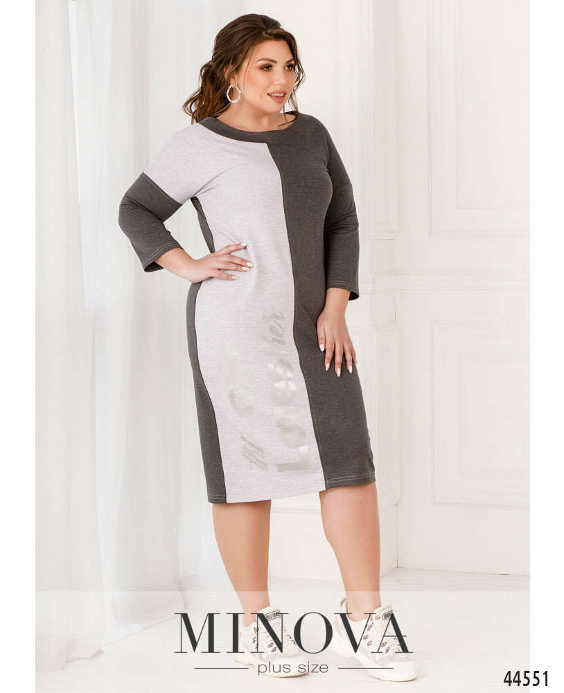 Элегантное контрастное платье плюс сайз с вырезом горловины "лодочка" и принтом на светлой стороне. Спинка однотонная. Вырез горловины с манжетом, рукава без манжет. Линия плеча приспущена. Карманов и застёжек нет.