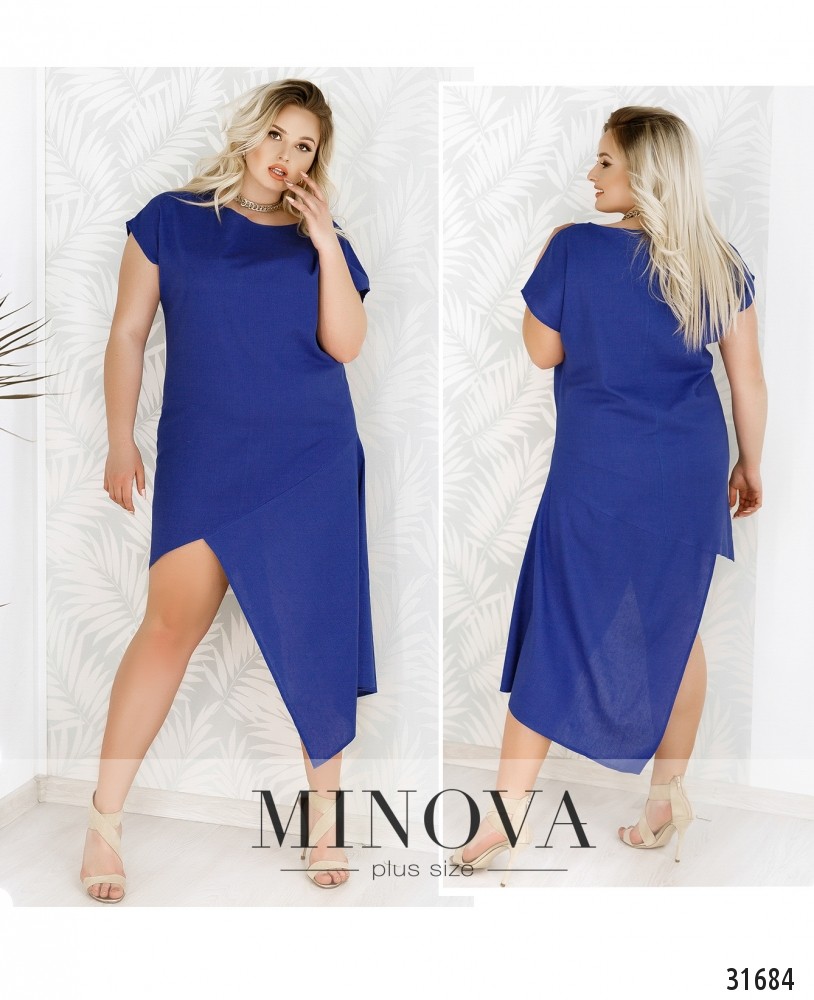 Яркое трендовое платье с короткими рукавами и круглым вырезом. Платье с ассиметричным подолом.
