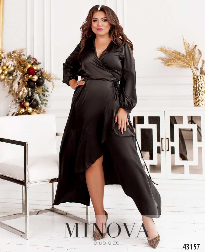 Элегантное платье на запАх с тонким пояском, который продевается на талии через отверстие. Застёжек и карманов нет. На талии ткань присобрана по бокам, подол украшен оборками. Рукава в пейзанском стиле: широкие, сужаются на запястьях, вместо манжет вшиты резинки.