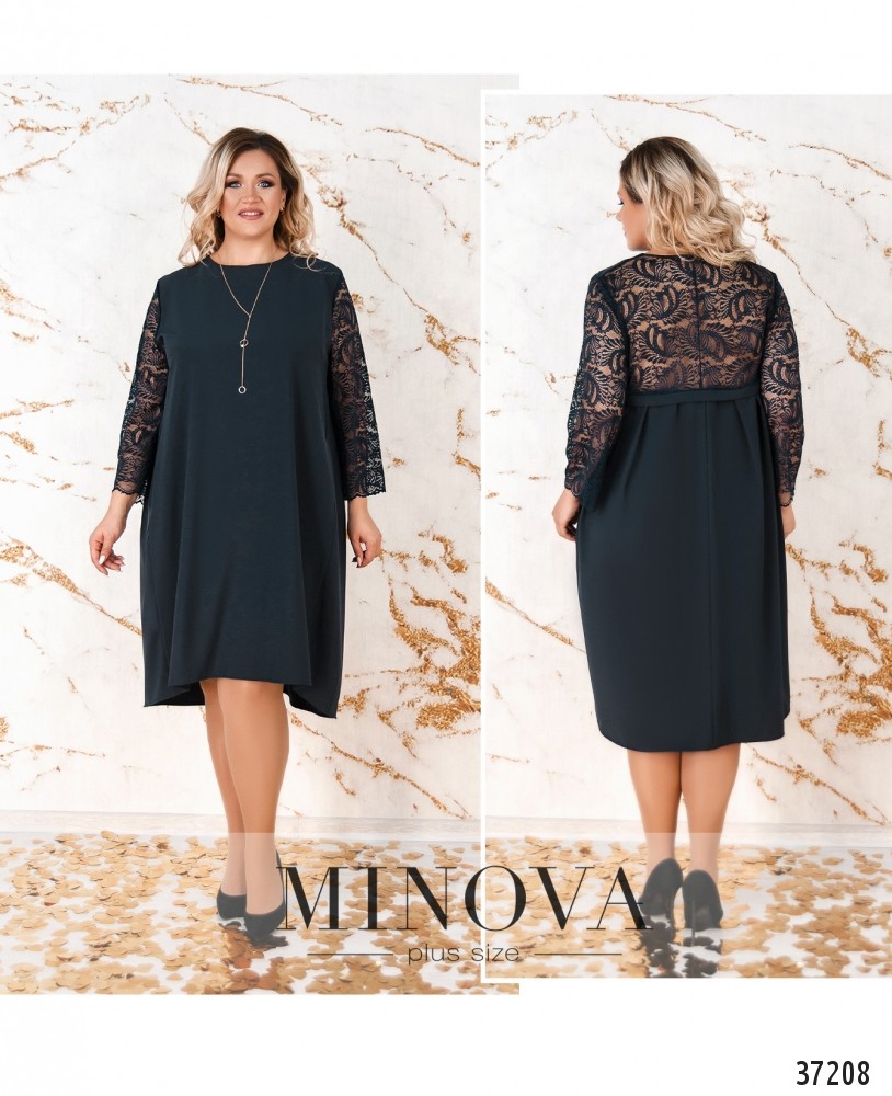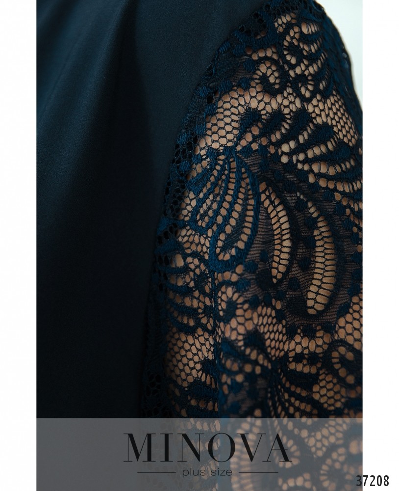 Не совсем стандартный крой представленного в новой коллекции женской одежды от Minova платья будет удачно подчёркивать достоинства «прямоугольной» и «грушевой» фигуры. На подоле от талии – диагональные вытачки до низу, так что платье получается асимметричным и создаёт эффект приталенности. Тем не менее, это платье А-силуэта. По бокам – врезные карманы. Ткань лёгкая и мягкая, а рукава – из прозрачного цветочного гипюра, без манжет. Гипюр украшает спинку до талии, и подол от него присобран, так что в итоге платье выглядит сзади более нарядным, чем спереди. Застёжек нет. Стоит дополнить образ туфельками на каблуке или танкетке.