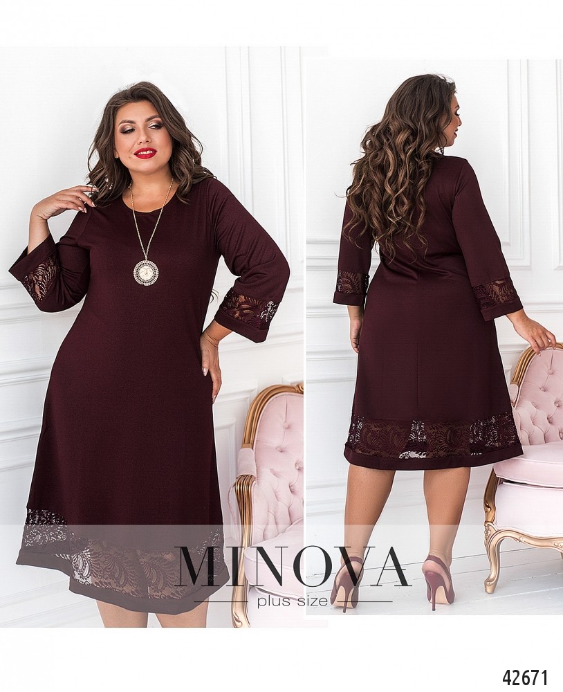 Минималистичное платье большого размера, А-силуэт, без застёжек и карманов, ткань декорирована нитями люрекса. На подоле и на рукавах - вставки кружева. В комплекте подвеска.