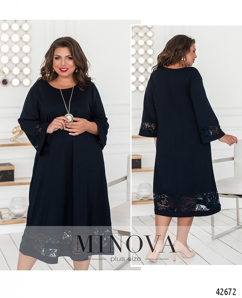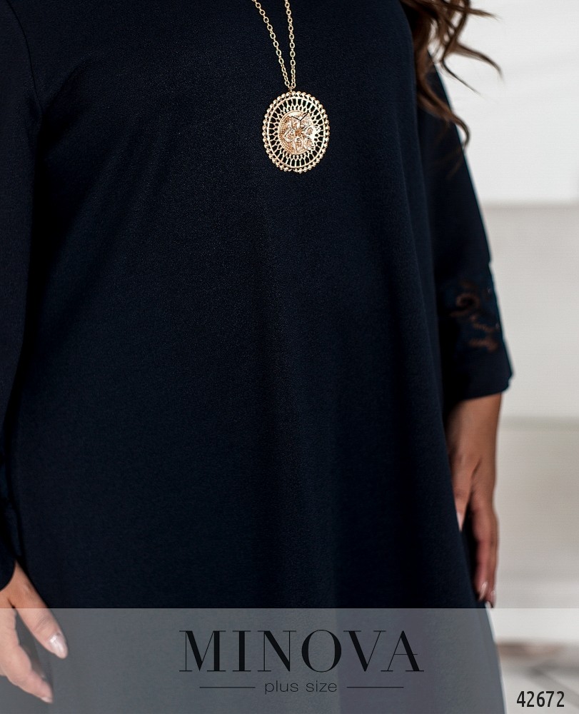 Минималистичное платье большого размера, А-силуэт, без застёжек и карманов, ткань декорирована нитями люрекса. На подоле и на рукавах - вставки кружева. В комплекте подвеска.