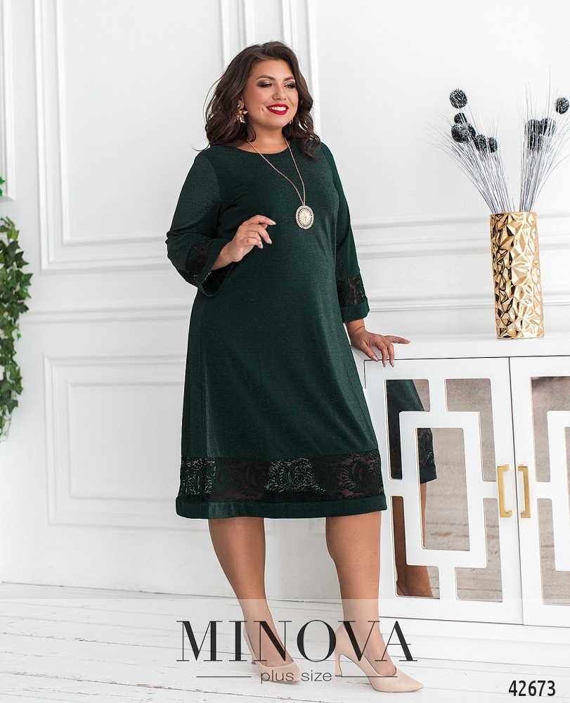 Минималистичное платье большого размера, А-силуэт, без застёжек и карманов, ткань декорирована нитями люрекса. На подоле и на рукавах - вставки кружева. В комплекте подвеска.