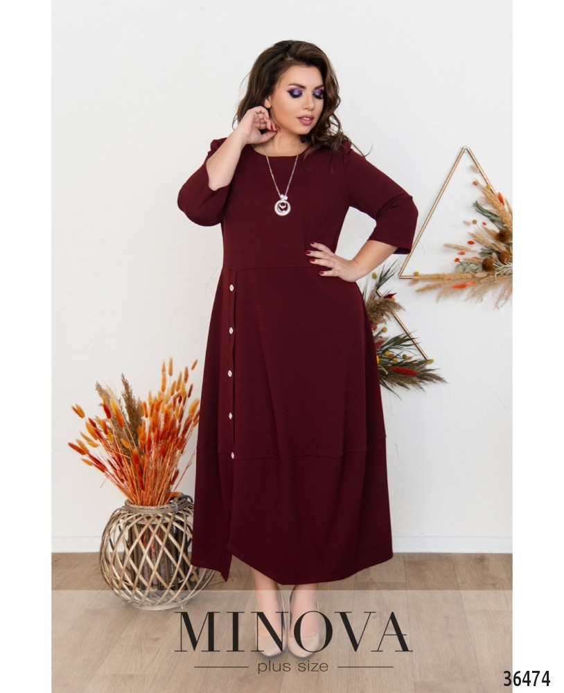 Привлекательное однотонное платье батал А-силуэта представлен в новой коллекции женской одежды батал от Minova. Платье из мягкой, лёгкой ткани. Рукава длиной ¾, без манжет. Вырез горловины полукруглый, неглубокий, подол подшит к лифу, а к низу подола подшит широкий отрез ткани, ещё более расширяющий его. Карманы отсутствуют, застёжка – вшитая по спинке змейка. Спереди на подоле – ряд декоративных пуговиц, на груди – небольшие вытачки. На плечах изнутри подшиты мягкие накладки. Платье можно смело вписать в свой базовый гардероб, дополняя его каждый раз новыми украшениями и выбирая разную обувь. Украшение входит в комплект.
