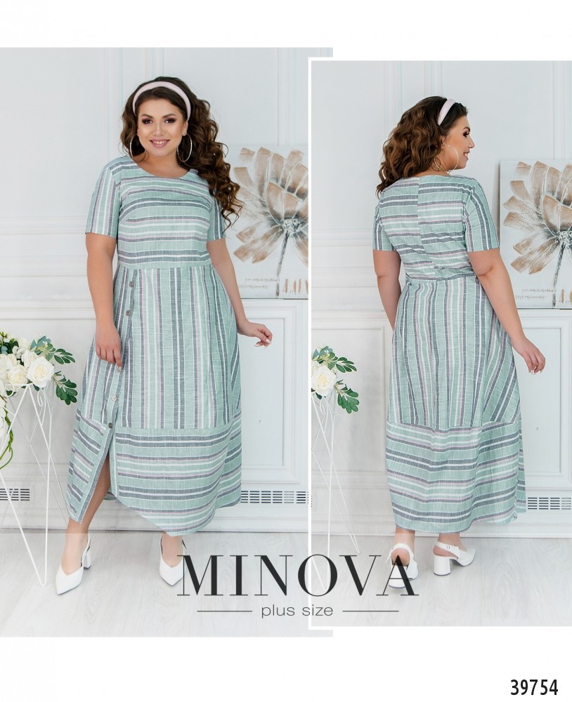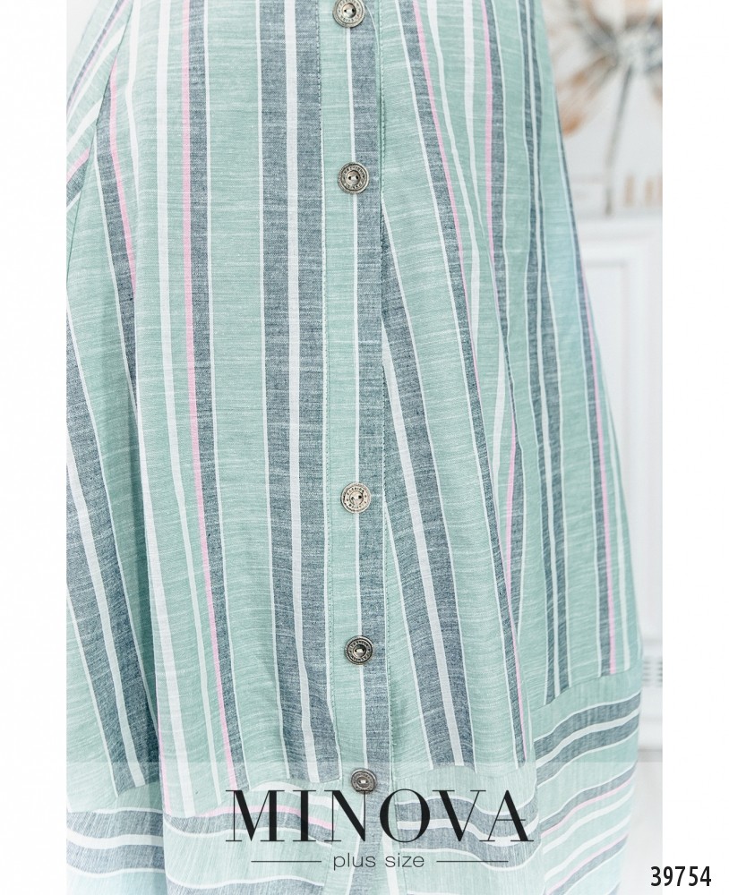 Стильное полосатое платье большого размера без карманов, на подоле - декоративные пуговицы, под ними - разрез, на груди вытачки. Застёжка - вшитая по спинке молния.
