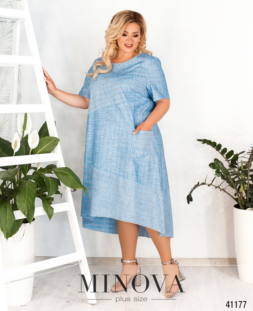 Элегантное платье батал с асимметричными вставками по диагонали, подол длиннее по спинке. На боку - накладной карман, слева сбоку вшита потайная молния. На груди вытачки, вырез горловины полукруглый. Платье А-силуэта.
