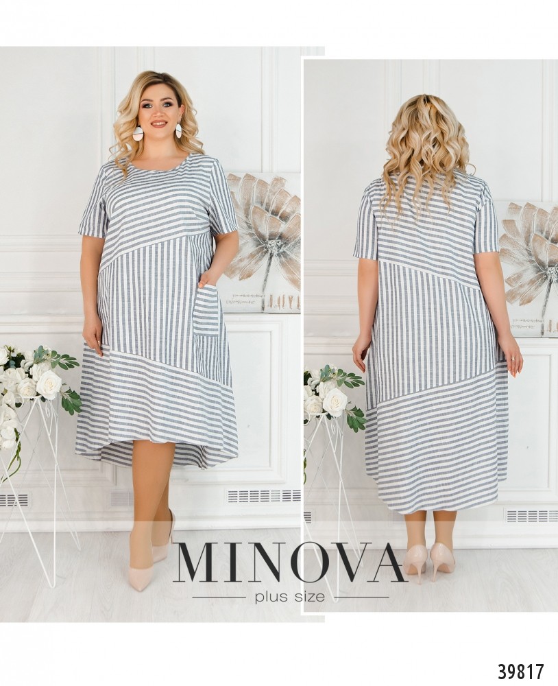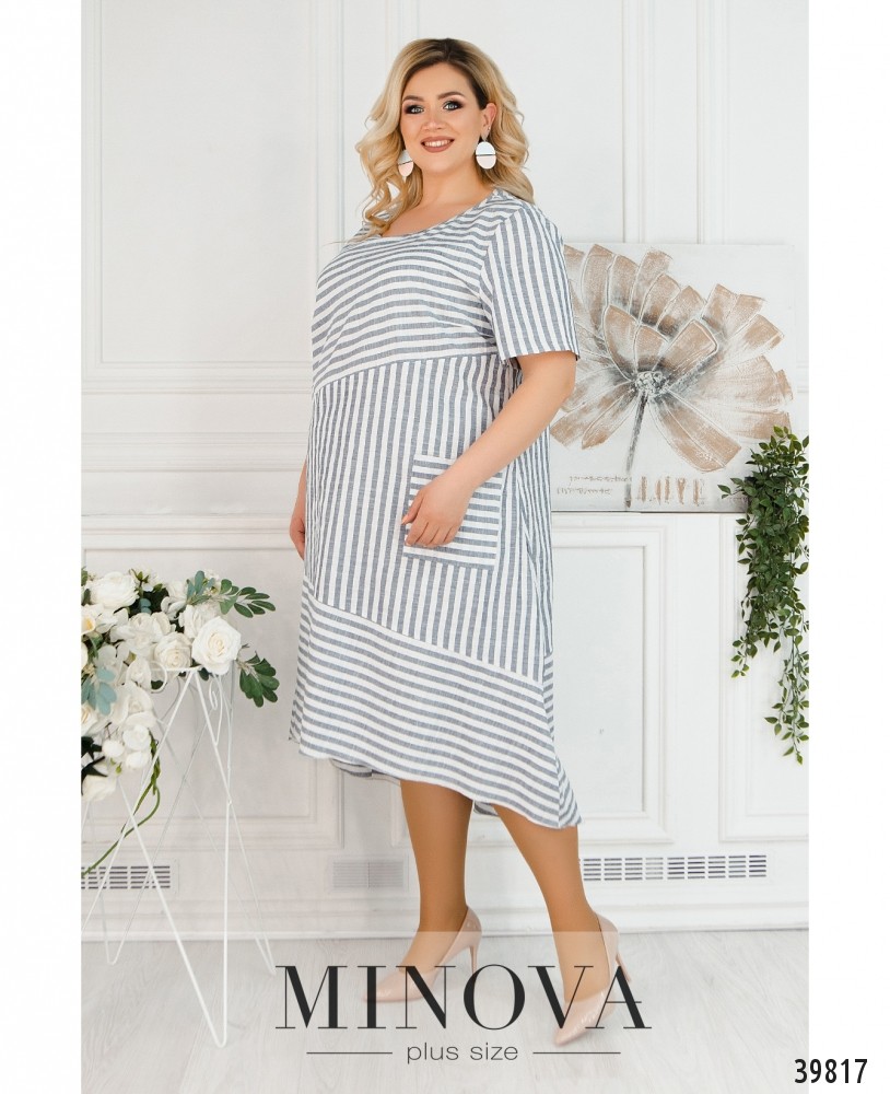 Очаровательное платье батал с разнонаправленным полосатым узором. Слева на подоле - накладной карман. Подол асимметричный, по спинке длиннее. Рукава без манжет. Застёжка - потайная молния, вшитая под левым рукавом.