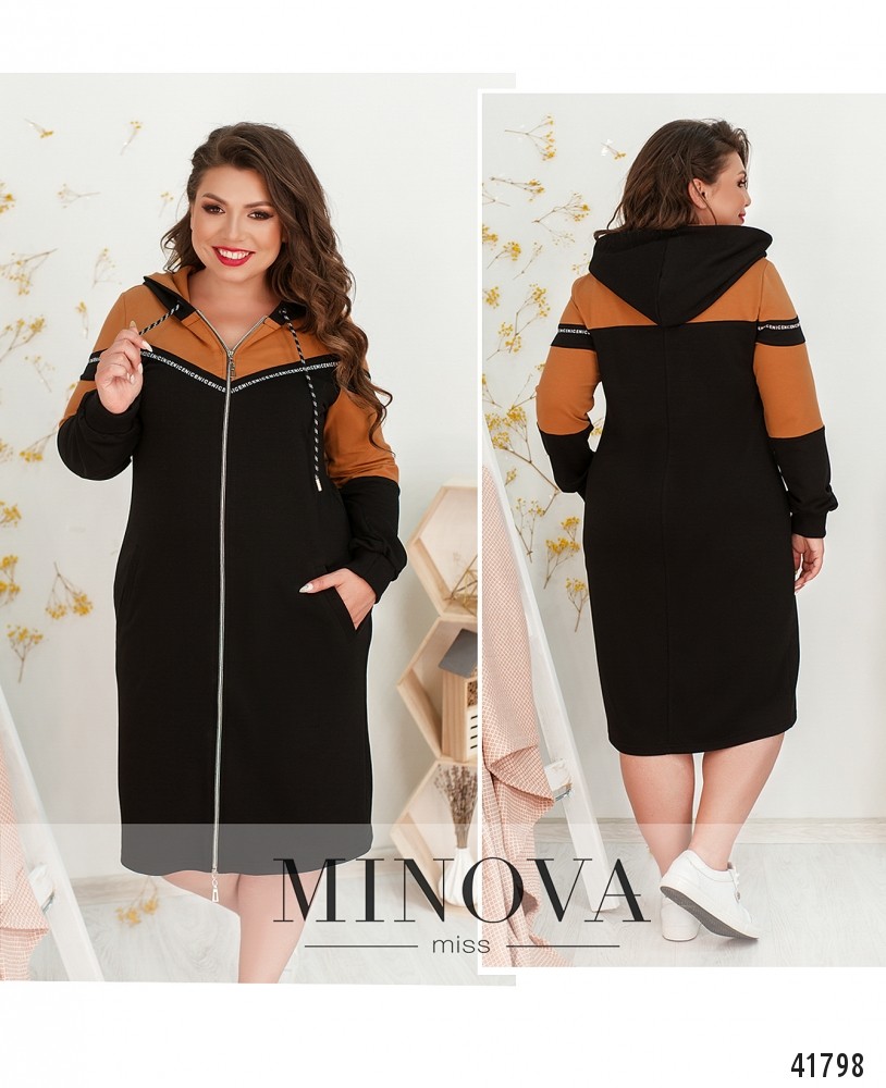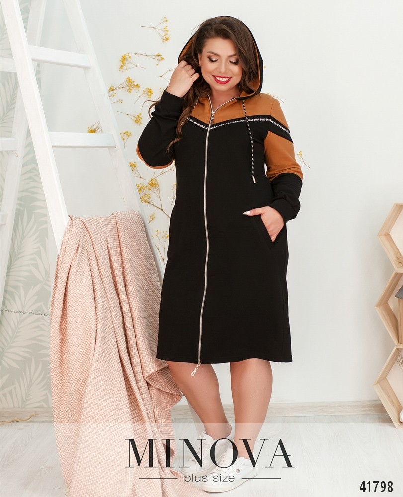 Мягкое спортивное платье большого размера с молнией по центру, от капюшона до низу. Через капюшон пропущен шнурок с наконечниками. Рукава с мягкими манжетами.