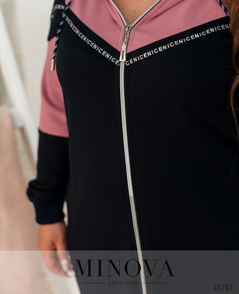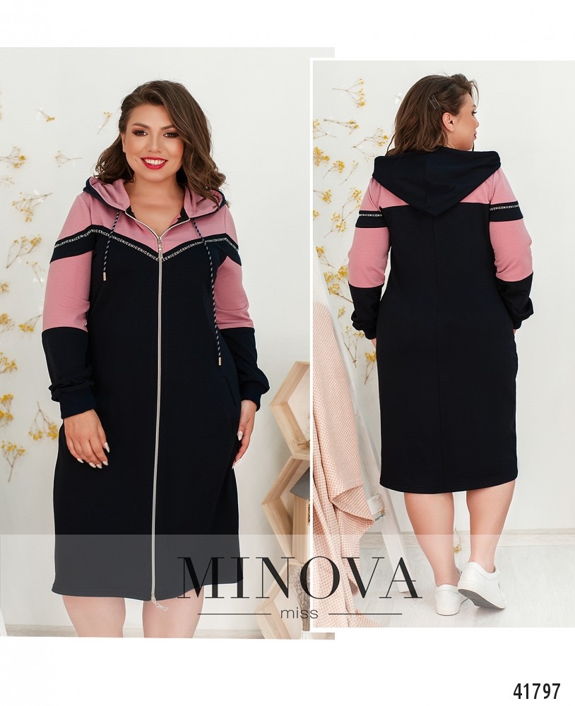 Мягкое спортивное платье большого размера с молнией по центру, от капюшона до низу. Через капюшон пропущен шнурок с наконечниками. Рукава с мягкими манжетами.