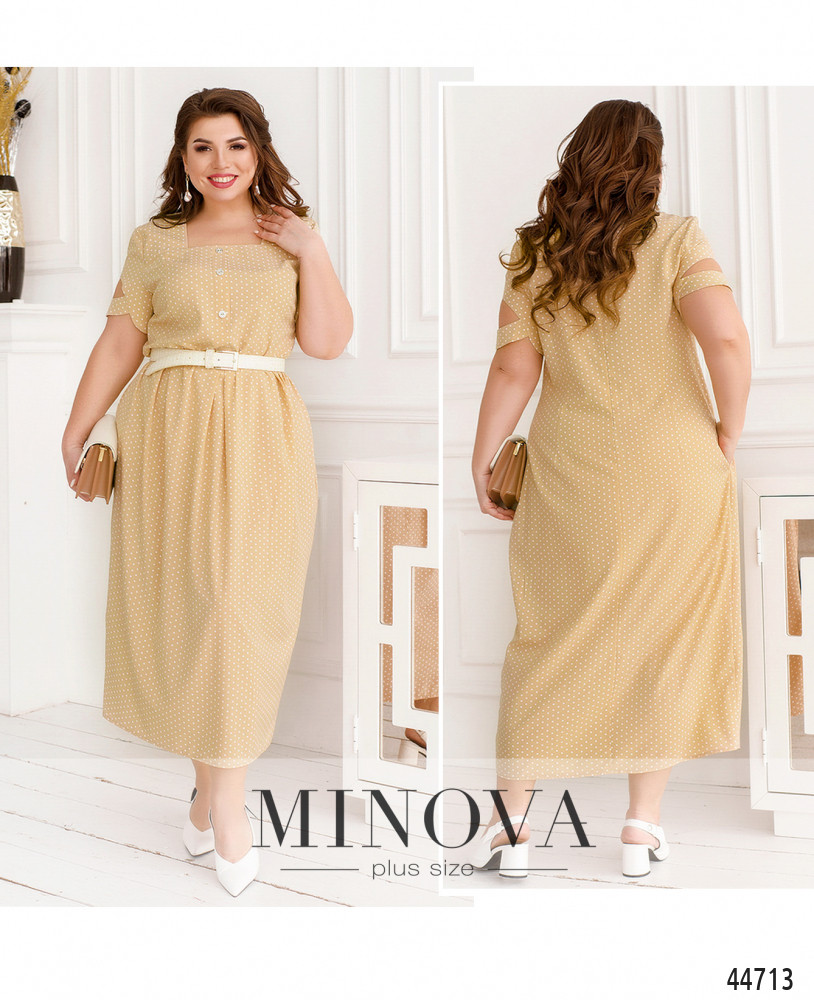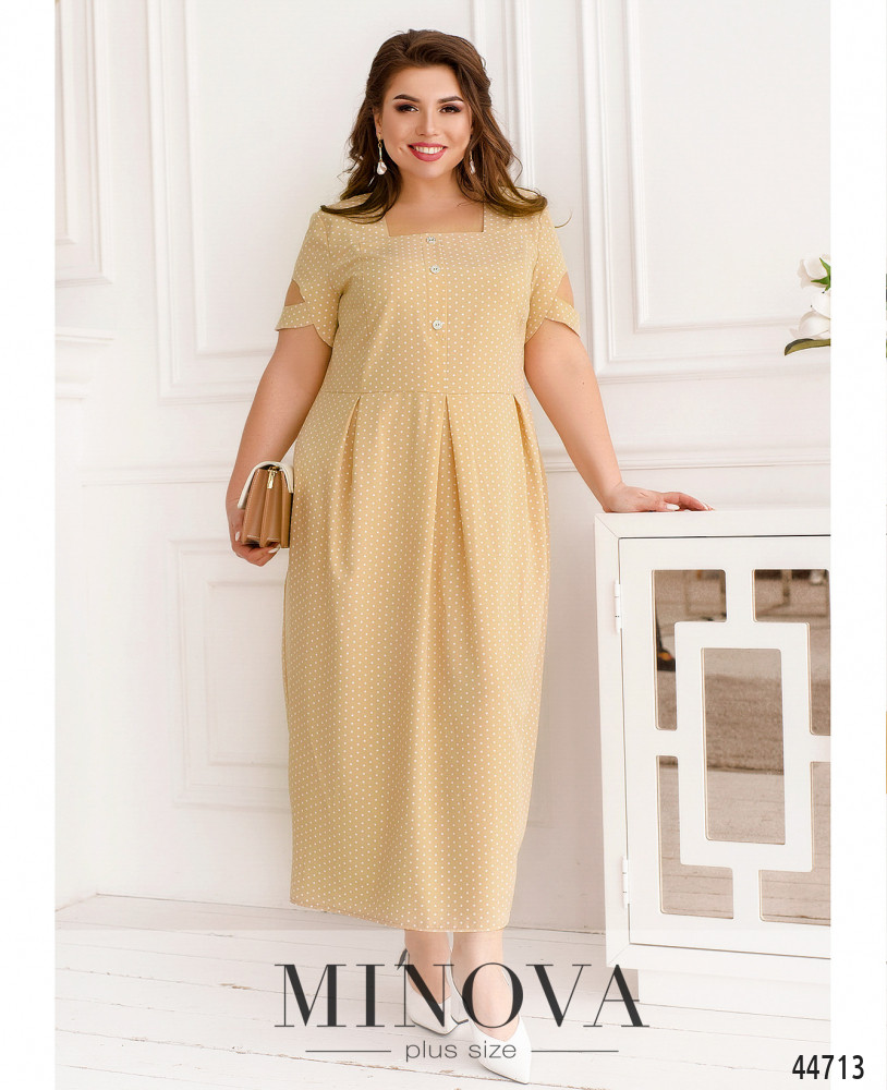 Элегантное и лёгкое платье батал с вырезом горловины "каре", от него до отрезного подола - ряд декоративных пуговиц на талии. Рабочая застёжка - молния, вшитая сзади по спинке. Рукава короткие с вырезом. На талии вытачки, ткань подола присобрана. По бокам - карманы в шве.