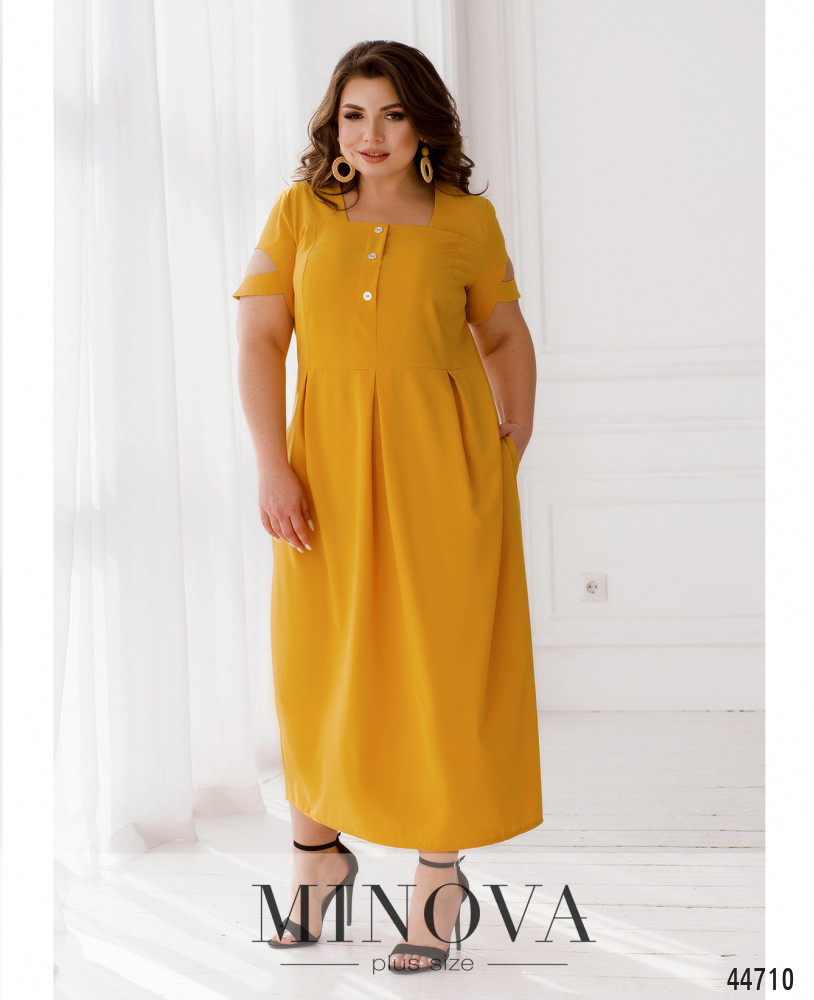 Изысканное минималистичное платье батал с вырезом горловины "каре". Подол отрезной, ткань на подоле присобрана, на талии вытачки. По бокам - карманы в шве. Застёжка - вшитая по спинке молния, на лифе до талии - декоративные пуговицы. Рукава с округлым вырезом.