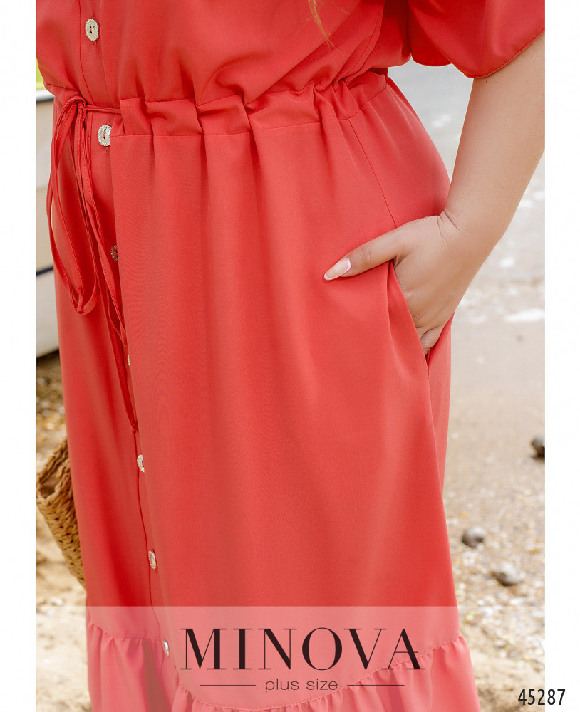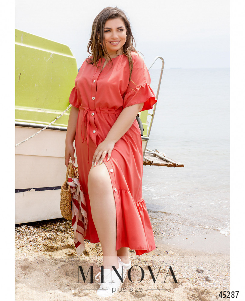 Яркое платье батал с короткими рукавами-оборками, застёжка - ряд пуговиц спереди на планке. Подол с длинными оборками. По бокам - карманы в шве. Через талию под кулиской пропущен шнурок.