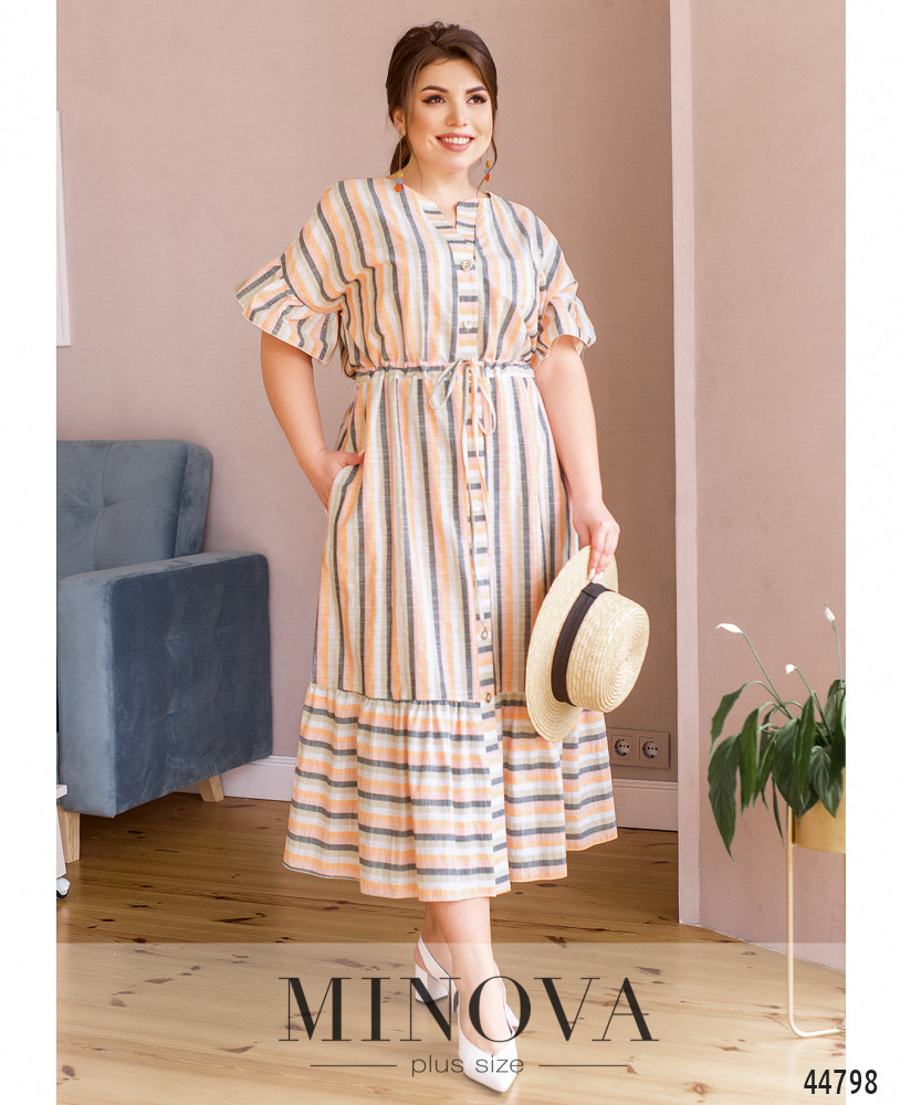 Яркое платье батал с короткими рукавами-оборками, застёжка - ряд пуговиц спереди на планке. Подол с длинными оборками. По бокам - карманы в шве. Через талию под кулиской пропущен шнурок.