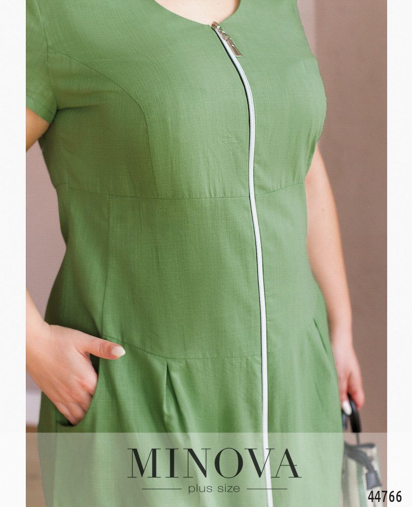 Нежное и минималистичное платье плюс сайз с полукруглым вырезом горловины, застёгивается на сквозную молнию спереди по центру. Рукава короткие, без манжет. На лифе полукруглые длинные вытачки, подол отрезной, на подоле сзади от талии - продольные вытачки, спереди ткань немного присобрана на поясе по бокам. Есть карманы.