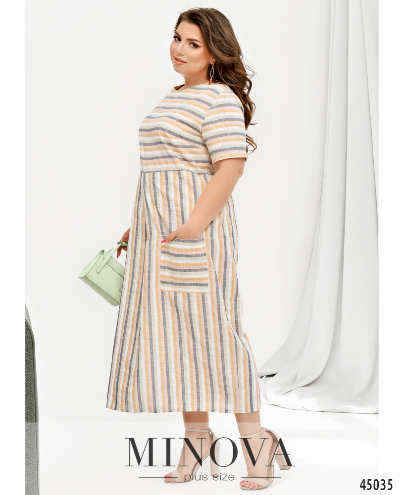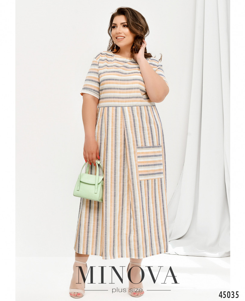 Яркое и стильное платье батал в полоску. На бедре - накладной карман, рукава короткие, с небольшими подворотами. Застёжка - вшитая по спинке потайная молния. Подол отрезной. На груди вытачки. Ткань подола на талии слегка присобрана плиссированными оборками. Вырез горловины полукруглый.