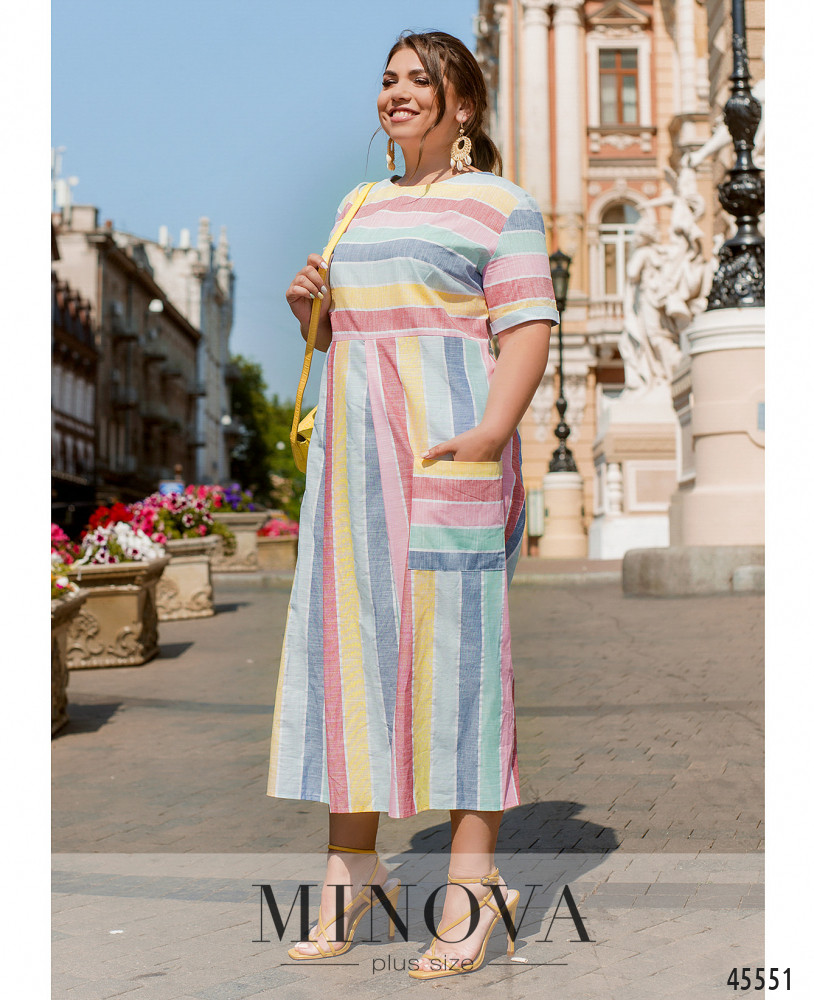Яркое и стильное платье батал в полоску. На бедре - накладной карман, рукава короткие, с небольшими подворотами. Застёжка - вшитая по спинке потайная молния. Подол отрезной. На груди вытачки. Ткань подола на талии слегка присобрана плиссированными оборками. Вырез горловины полукруглый. Пояс НЕ входит в комплект.