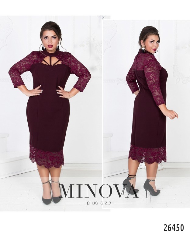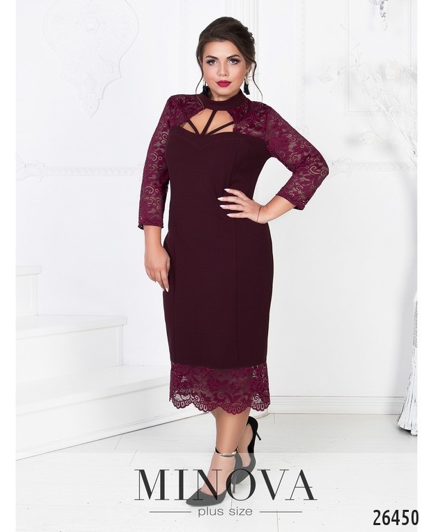 Женственное платье по фигуре, подчеркивающее сексуальные изгибы тела. Крой лифа вверху напоминает бюстье. Декольте оформлено в виде геометрического выреза с высокой горловиной, кружевом и декоративными планками. Рукава и отрезная кокетка на спине выполнены из кружева. Зауженный подол оформлен широкой кружевной полосой. На спине платье застегивается на скрытую молнию.