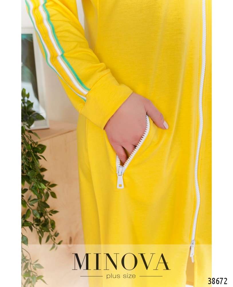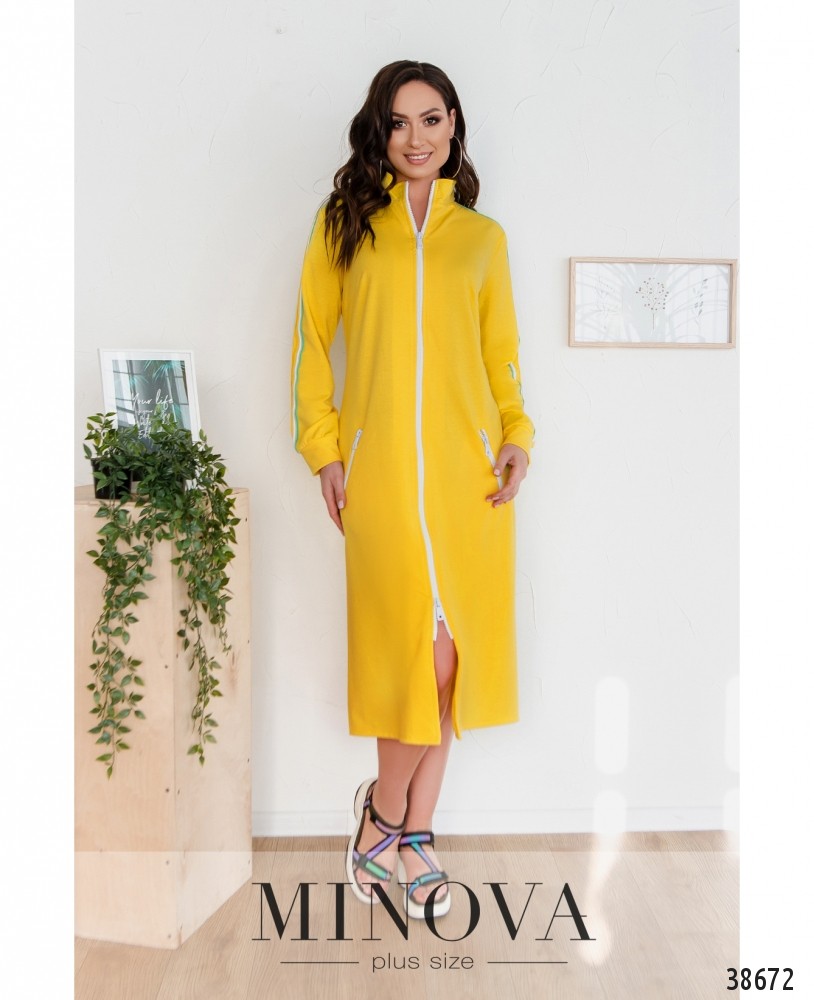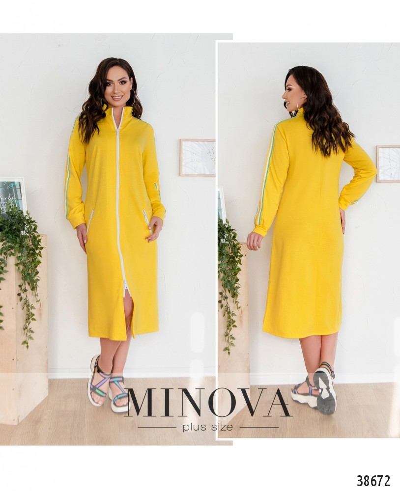 Стильное платье батал на каждый день в спортивном стиле. Застёгивается на молнию по центру, по бокам – врезные карманы под молнией. Рукава с мягкими небольшими манжетами. Воротник невысокий. На рукавах – контрастные ленты.