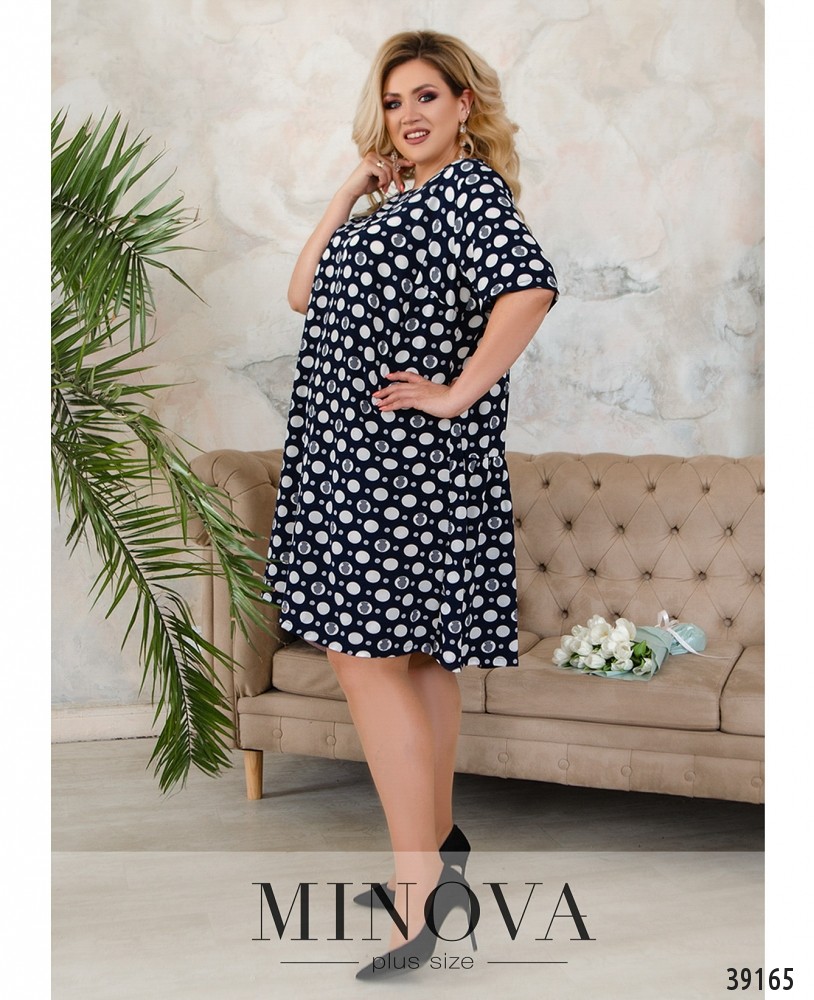 Платье батал в крупный горох, без застёжек и карманов, со свободными рукавами и полукруглым вырезом горловины. Передняя часть ровная, спинка - с крупными оборками на подоле.