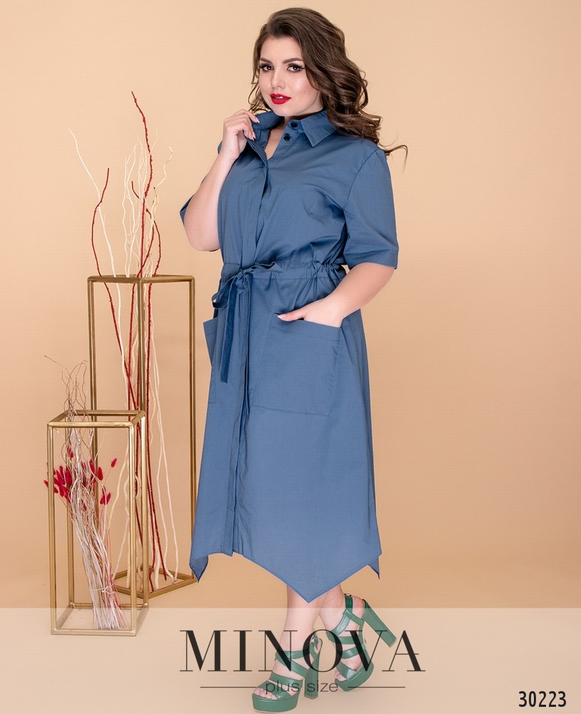 Платье-рубашка в стиле «сафари» с асимметричным подолом. Платье полностью застегивается на пуговицы на лицевой стороне. Талия регулируется вшитым поясом-кулиской и завязывается на лицевой стороне. Подол дополнен накладными карманами.