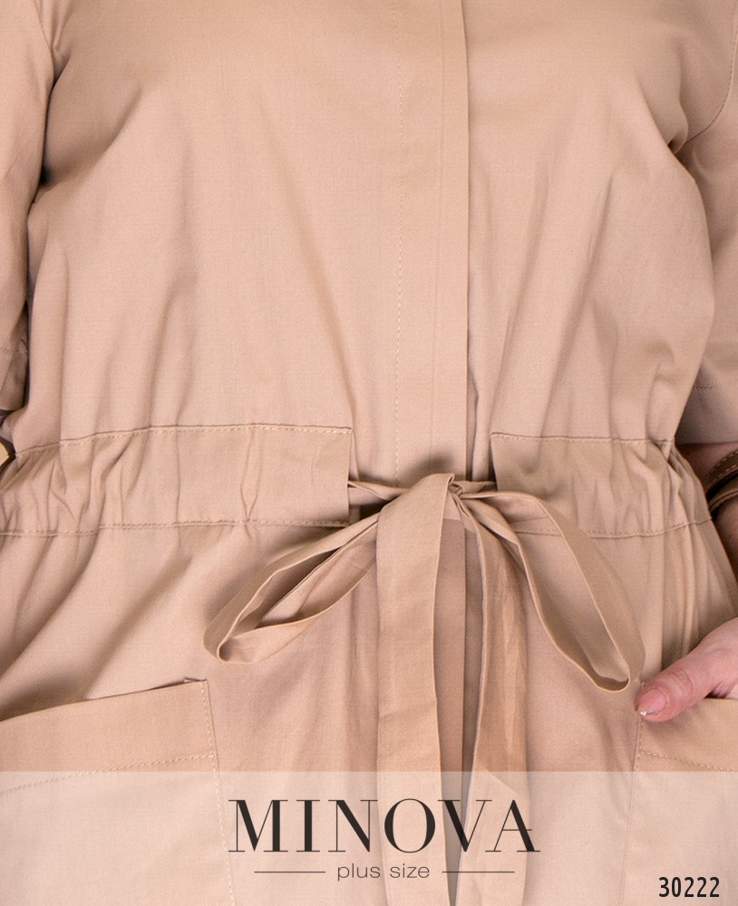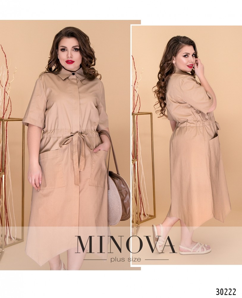 Платье-рубашка в стиле «сафари» с асимметричным подолом. Платье полностью застегивается на пуговицы на лицевой стороне. Талия регулируется вшитым поясом-кулиской и завязывается на лицевой стороне. Подол дополнен накладными карманами.