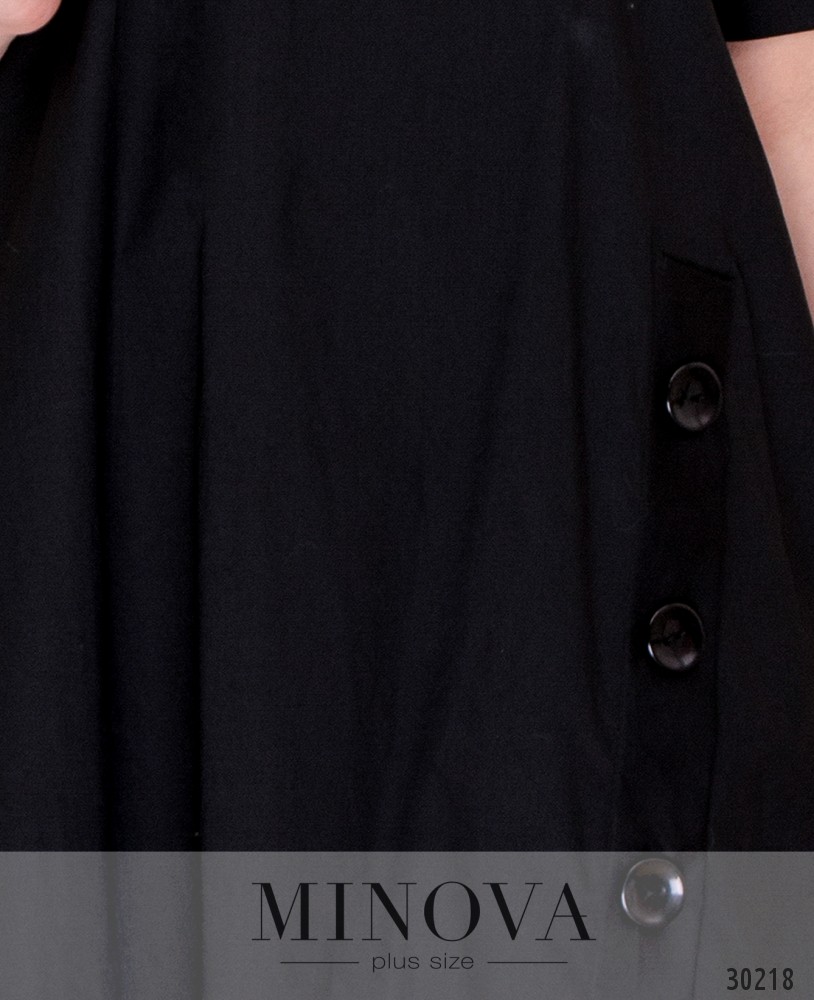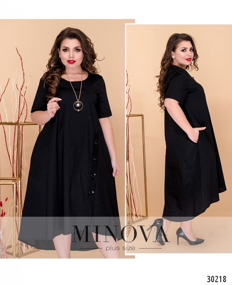 Свободное платье с неровным подолом. Платье с короткими рукавами от груди свободно ниспадает. Объемный подол украшен декоративными пуговицами на лицевой стороне.