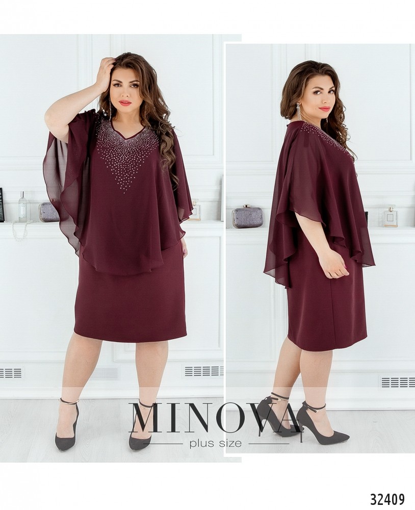 Платье батал от Minova с пришитой пелеринкой, украшенной стразами, выглядит как блуза с юбкой-карандашом. Свободное, приятное к телу, оно великолепно будет смотреться на девушке, у которой плечи уже, чем бёдра (типа «груша») – аакцент будет на верхней части. Сзади – небольшой вырез по спине, застёгивается на пуговку. Платье большого размера представлено в каталоге Minova в четырёх цветах, практически на все случаи жизни: строгое чёрное, романтическое кремовое, страстное бордо или нежное голубое. Рукава-крылышки не прилегают плотно к телу и придают образу воздушности.