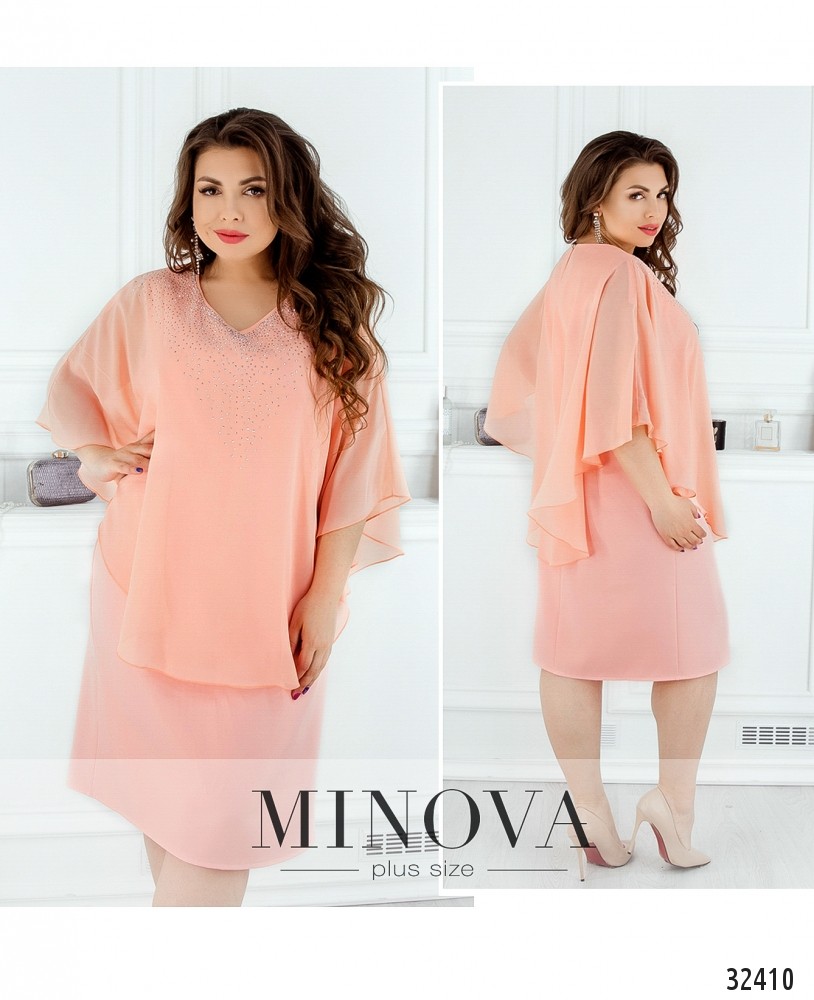 Платье батал от Minova с пришитой пелеринкой, украшенной стразами, выглядит как блуза с юбкой-карандашом. Свободное, приятное к телу, оно великолепно будет смотреться на девушке, у которой плечи уже, чем бёдра (типа «груша») – аакцент будет на верхней части. Сзади – небольшой вырез по спине, застёгивается на пуговку. Платье большого размера представлено в каталоге Minova в четырёх цветах, практически на все случаи жизни: строгое чёрное, романтическое кремовое, страстное бордо или нежное голубое. Рукава-крылышки не прилегают плотно к телу и придают образу воздушности.